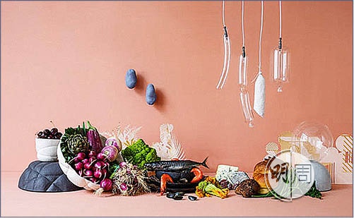 食物是這系列的主角,其中Tubercule灰藍色薯仔掛鈎由Scmp Design Office設計,以水泥製成,一組兩個薯仔的有機形態仿真度高,由無數個法國農夫種的薯仔中千挑萬選而來;Succession碟盤外面質感略帶粗糙,由瑞典設計二人組FÄRG & BLANCHE設計,交由近二百五十年歷史的法國陶瓷廠REVOL製作,每個碟子都由繩子束紮過,就如火腿那樣保留製作痕迹。