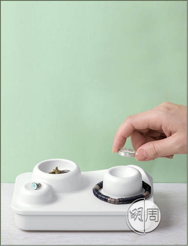 Landscape系列的置物盒的蓋子,把複雜的地貌簡化至簡單的線條,高低起伏的變化,就是桌上小物的棲息空間。「山谷」的靈感來自台灣東部的山脈,谷地與山稜高低落差,最好用來放置眼鏡、名片或手機等長形產品。「丘陵」由三個高低與直徑不一的小山組成,山口的凹槽剛好用來放項鏈、耳環、戒指等小飾品。「火山」的山口是一個筆筒,由開口流出的熔岩在地面上劃出四格分區,把各種零散小物分門別類。「瀑布」的懸崖把盒子分為一高一低兩部分,細緻的水流溝槽可防止物品滾動,適合放置鑰匙、項鏈等小物,亦能放置銀包、電話等較大型物件。