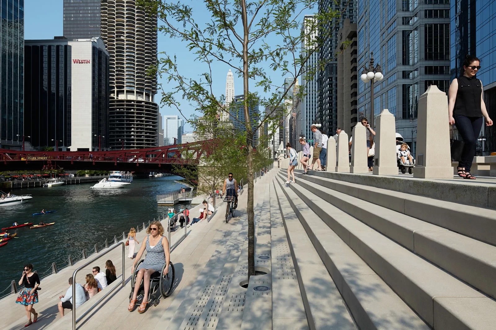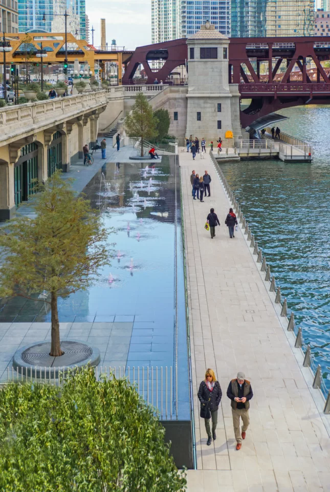 芝加哥十九世紀曾是製造業重鎮,其後轉型為金融中心,卻令市中心的芝加哥河因嚴重污染而荒廢,現在搖身一變成為市民跑步及遊船河觀光勝地。芝加哥河畔漫步分成九段,包括設有泊船碼頭及零售商店的The Marina、划船和皮艇租賃服務的The Cove、讓遊人席地而坐的River Theater、讓小孩觸摸水的The Water Plaza、魚類棲息地The Jetty等。「最重要是興建河畔行人走道,讓人暢通無阻地由北面主要購物區漫步往南面商務區,清除原有天橋阻擋去路的問題。」
