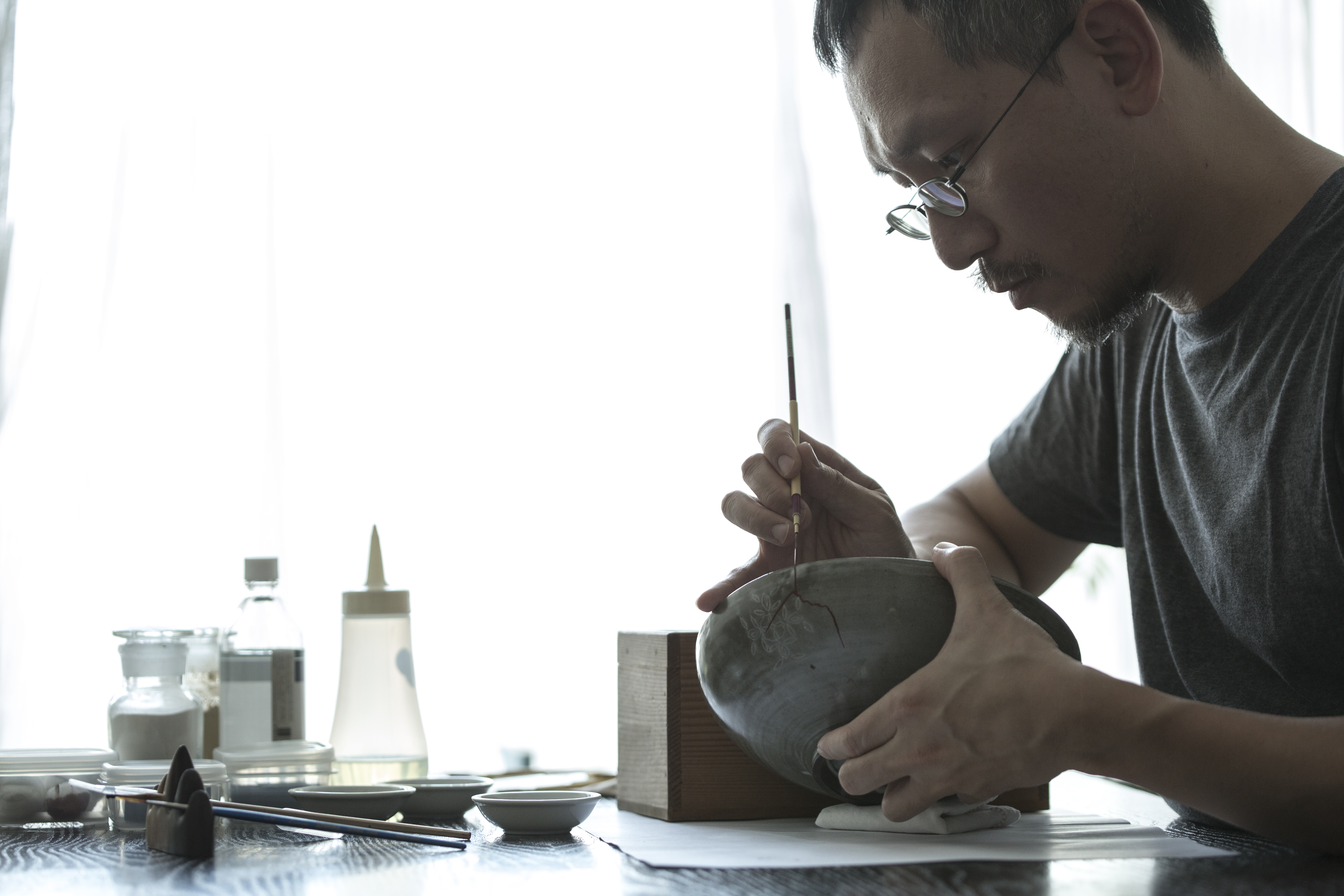 他解釋,每次上漆都要等一星期,視乎破損程度,每件作品等閒花一個月或以上,絕對不能心急,針對崩口、裂開、碎裂等不同破損情況,陶瓷有否上釉,都有不同處理,而且用料也有分別,「由於錫是有毒的金屬,只可用來修補花瓶之類的用品,修復食器必須用真金或純銀,確保食用安全。」用色也講究,若是淺色食器多會使用金粉,深色的則用銀粉,突顯線條色澤。完成後還要用鯛魚牙多番打磨及拋光,金線才會閃閃發亮。