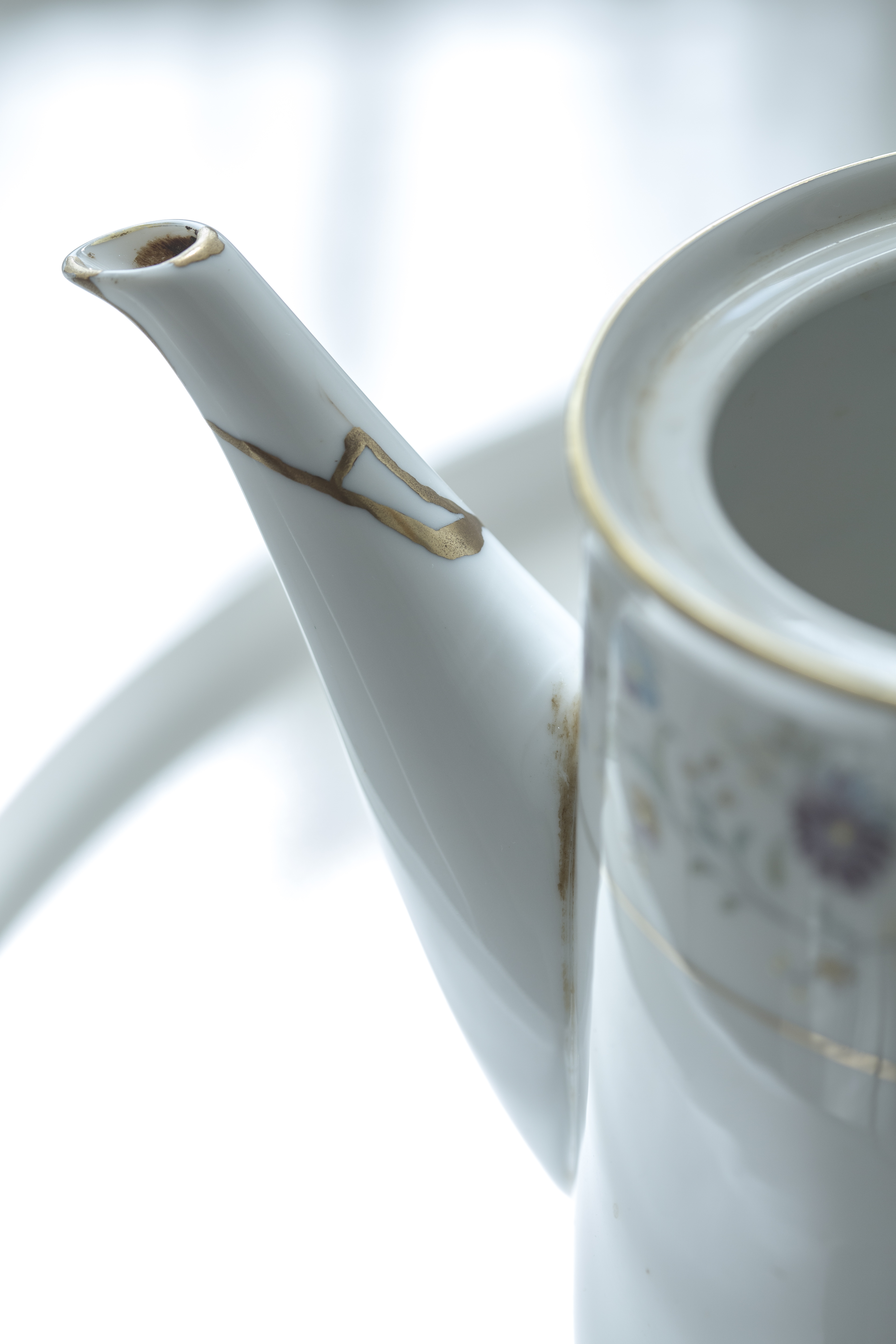 修補是否為把破損之物恢復原貌,徹底掩蓋裂痕?日本的金繼(又稱金繕)工藝卻把裂痕成為物件的特色,每道裂痕都是一段故事。眼前一個茶壺,屬日本名古屋高級瓷器名牌Nonotaki,原本壺嘴斷裂,如今卻有一圈金線覆蓋,不覺兀突,倒是與壺身金邊相呼應,正是經過金繼修復。