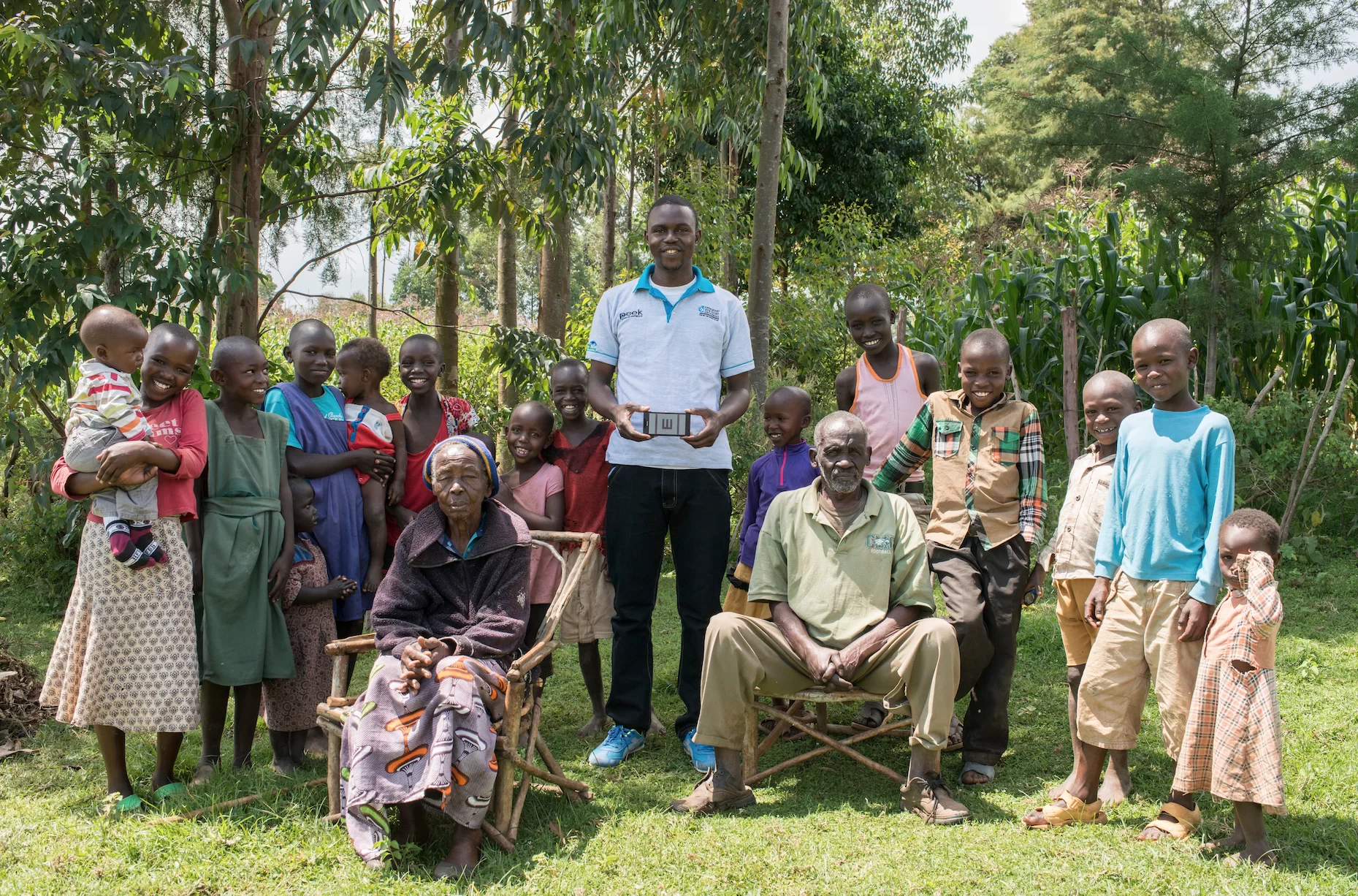 眼科團隊只需一輛單車、一部手機和一 個太陽能背包,就可以主動走進居民家找出眼疾病人,替住在偏遠、昂貴龐大的設備都無法抵達地區的人們做檢查。他更製作出一Peek工作人員Cosmas Bunywera (中)與已接受視力測試的居民個地圖,點出每一個可以治療的白內障或眼疾病人,甚至標示出該社區的長者或領袖, 確保能找到病人並願意接受治療。「老婆婆 Mama Wangari已經有十年看不見,從來沒 看過孫兒女的容貌,但最後只需要不足四十美元醫療費用,她就能夠重見光明。」