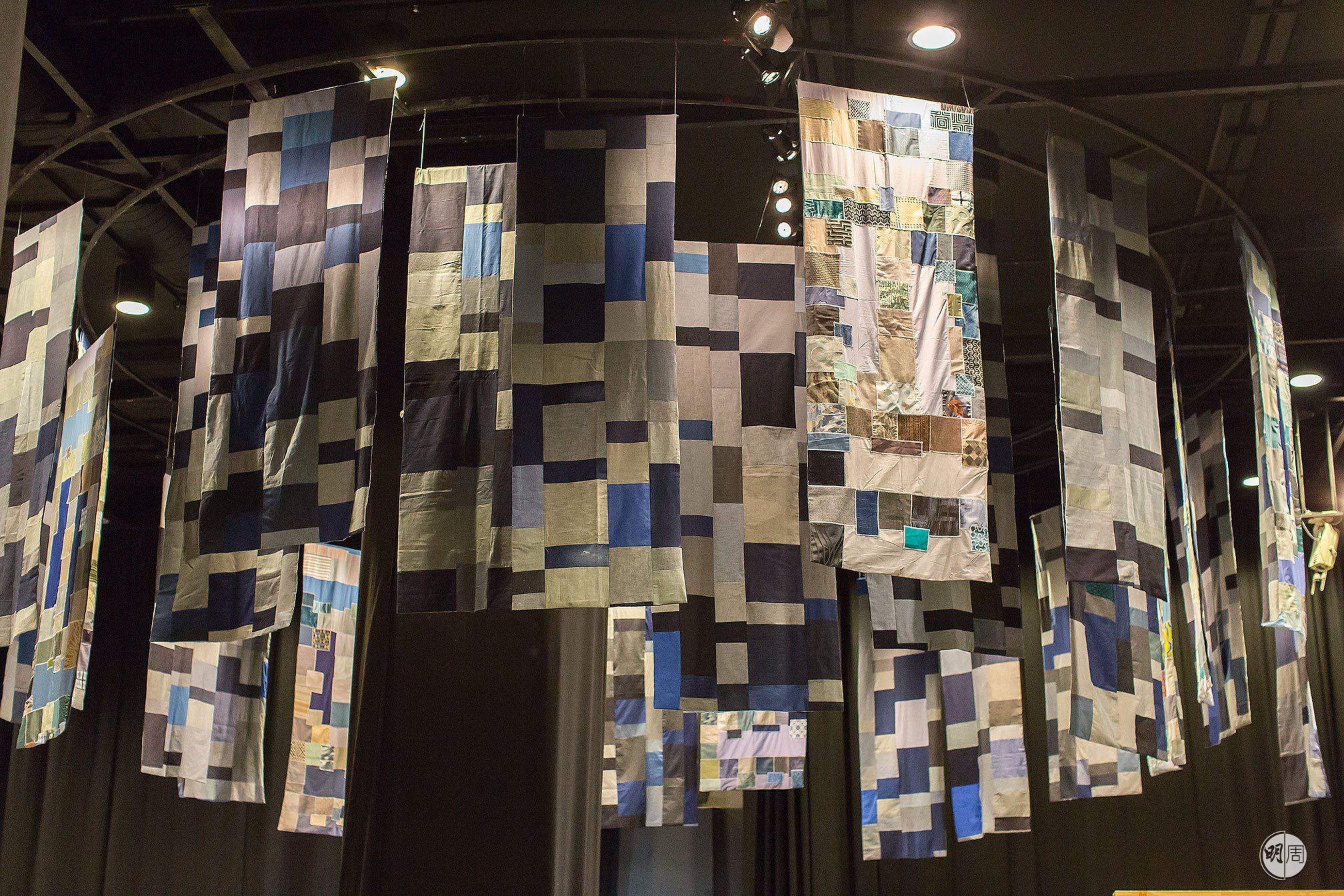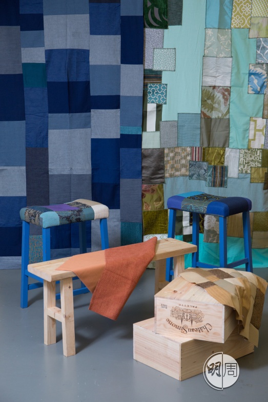 抬首一看,一幅幅巨大牛仔百家布半空懸掛,它前身是一批廢棄布碎,由一家牛仔布廠捐出,交由灣仔聖雅各福群會升級再造中心的復康人士,把零散布碎車縫成一大塊完整布幔,想出這好點子的,是設計工作室”made in sample”,「牛仔褲廠每年都有大量布頭布尾剩下,動輒有一個貨櫃那麼多。」展覽設計師薛文諾(Clive)說道,他原本從事室內設計,每季面對物料供應商提供的大量窗簾布辦便大感頭痛,兩年前開始利用這些物料,車成拼布,為二手梳化、椅子等捫上新面料。