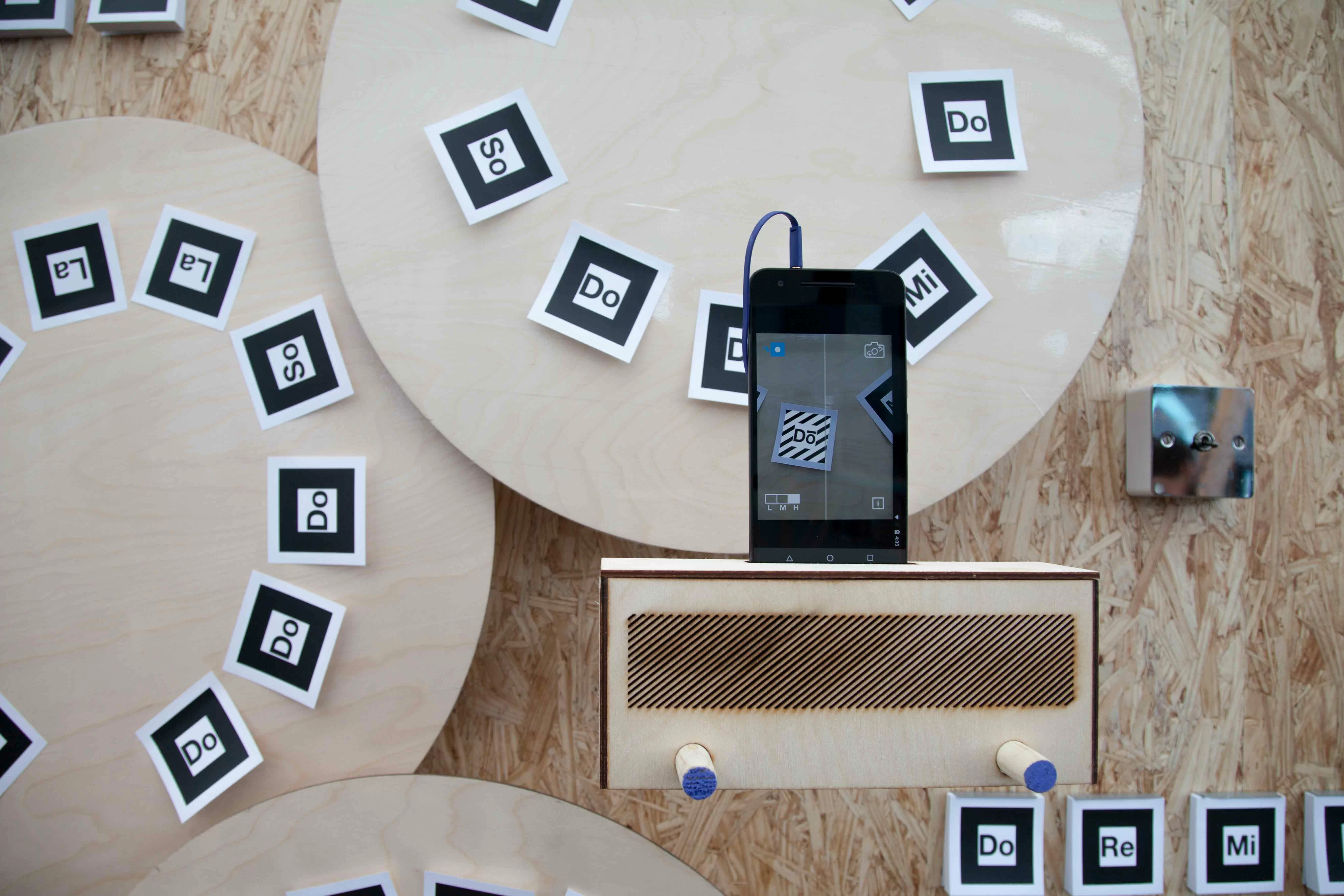 Yuri與Google合作設計的”AR Music Kit”手機應用程式,只要把音階紙貼在任何物件上,手機鏡頭掃描到標貼,便會發出聲音。(圖片:Yuri Suzuki網站)