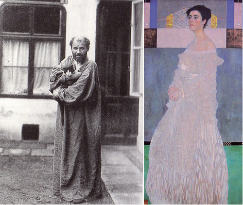這樣奇異的畫面當然和生活有關了。十九世紀末維也納的上流社會圈子是怎樣的?那是女性主義風起雲湧的時代,在富裕之家,有才華的女性當然不會願意安安靜靜地當賢妻良母,而喜歡在家中的沙龍招呼朋友,展示才藝,沙龍中可以結識當時的藝術家,像里爾克、穆齊爾(Robert Musil),畫家柯柯希加(Kokoschka)、克林姆,建築師路斯,音樂家荀貝格(Arnold Schönberg)等等。她們組織了維也納婦女俱樂部,會員中才女多得很,包括時裝設計師、布藝設計師,珠寶製作專家等等。她們彼此交流,也互相合作。正是這樣,克林姆結識了一羣女藝術家,其中不乏成為他終身的友伴,一起設計衣料、時裝和珠寶首飾。每次有新衣製成,穿上身,克林姆都樂於為她們造像。事實上,畫家自己也喜歡東方的衣裳,他常常穿長袍,由頸項開始,寬闊的布衣垂直散開,直垂到腳面,而他的女友之一,還會穿一襲他收藏的中國清朝的龍袍。