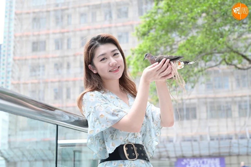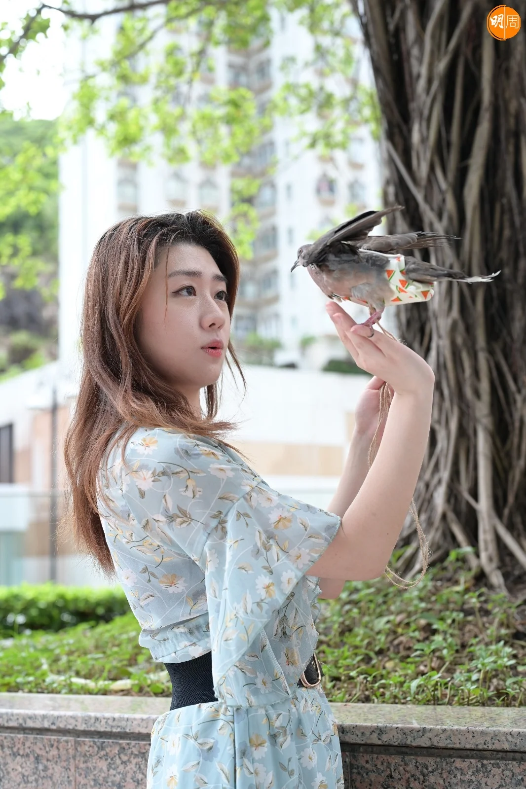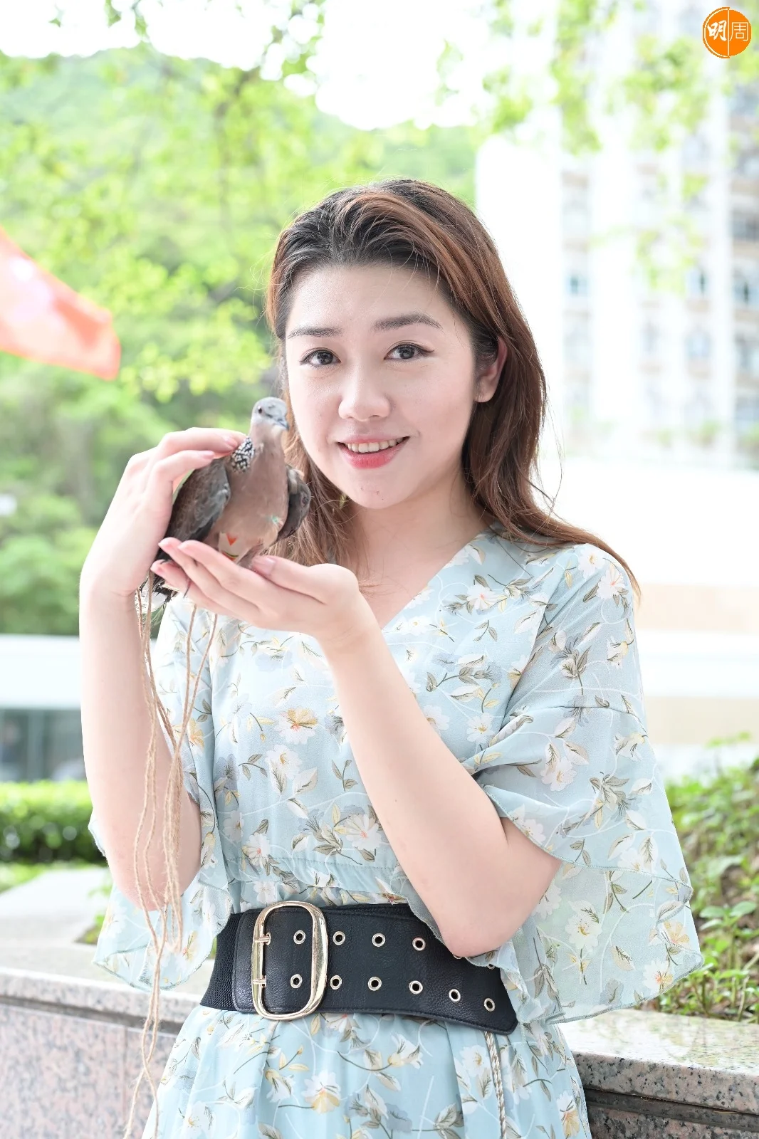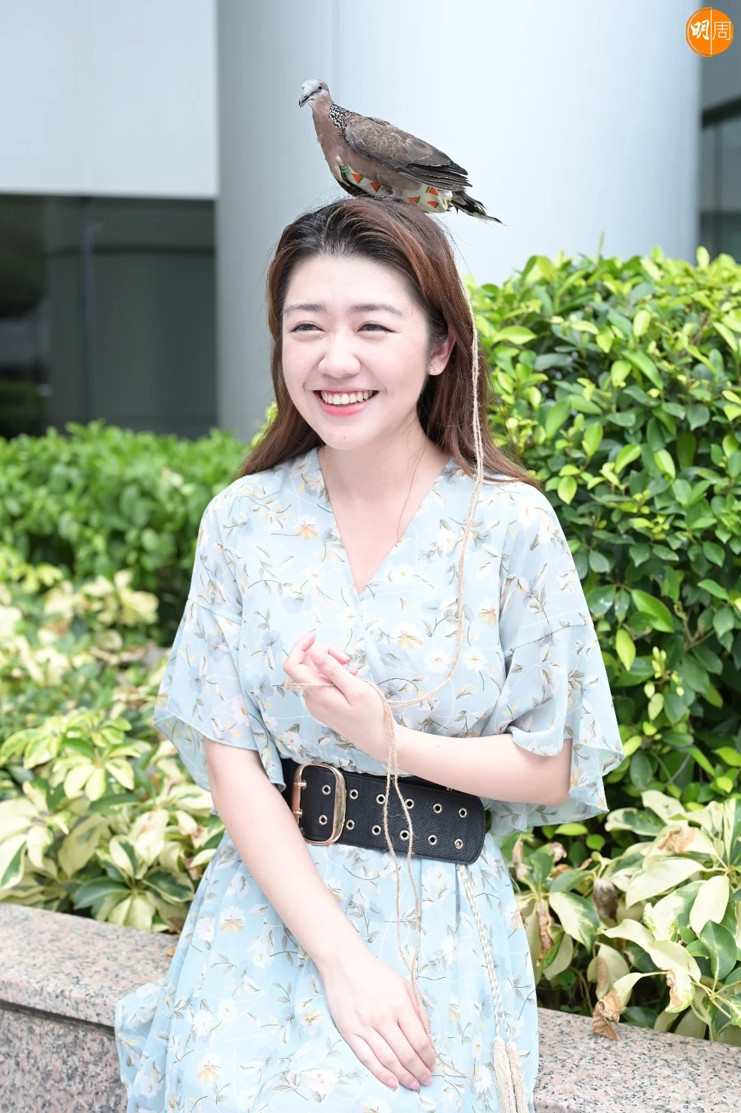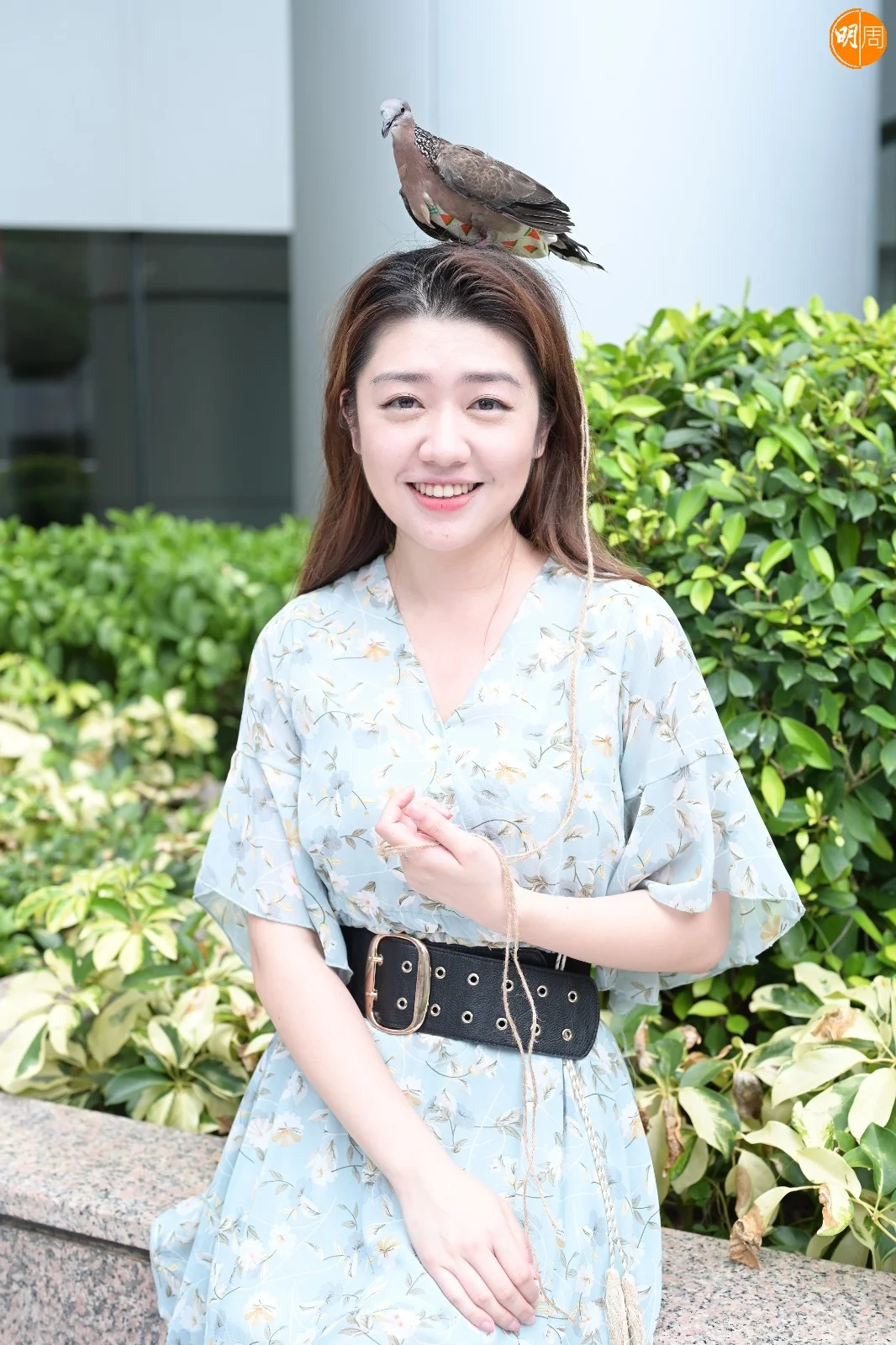 廖倬竩(Ivy)半年前經義工領養了一歲多的珠頸斑鳩荳荳,原本生活於大自然的荳荳,因不慎由樹上跌下,導致翅膀骨折,幸遇上雀鳥義工救治,但無法重回大自然,變成寵物鳥,一歲半的荳荳最愛在Ivy頭上休息,「牠已經把我頭頂當作是一個現成雀巢,可能質感像草,是牠們喜歡的感覺,雖然我是牠主人,但其實似保母比較多,因為我完全控制不到牠,每日當牠離開籠的一刻,牠想點就點,有時候會飛上我頭頂,有時叫極都不理會我。」荳荳小時候因不慎從樹上跌下來,幸好遇上雀鳥義工,得到醫治,最後因義工移民,令Ivy有機會領養牠,「荳荳細時從樹上跌下來,剛好救援鳥類的義工經過,救了牠,發現牠跌得很慘,兩隻翅膀都歪了,帶牠去看獸醫,原來翅膀已跌至骨折,無論怎樣修補都無辦法完全康復,所以牠沒有能力再重返大自然生活,後來因為義工移民台灣,需要尋找人去領養家中的雀鳥。」