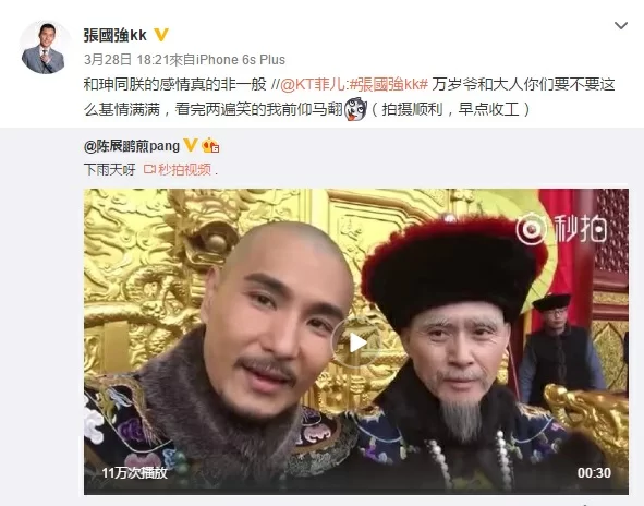 「視帝」陳展鵬似乎沒有受到與落選港姐單文柔緋聞而影響心情,未出街的劇集先有《同盟》,而他早前而在北京為新劇《天命》拍攝外景,又與好友陳山聰在萬里長城跑步,他日前又上載了自己與劇中演員張國強合唱古巨基的《友共情》,不少粉絲大讚展鵬唱功一流,不過惡搞張國強就有點穿越時空的感覺。