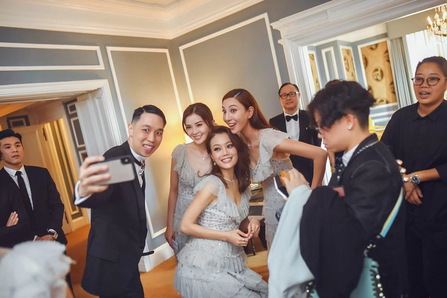 派對前,阿嬌同老公向長輩同契爺斟茶,完成後,一班好姊妹同兄弟團在酒店房內玩自拍,一對新人唔少得咀嘴,最搞笑係坐喺隔離嘅阿Sa同祖兒,照辦煮碗扮kiss擺甫士,笑死人!