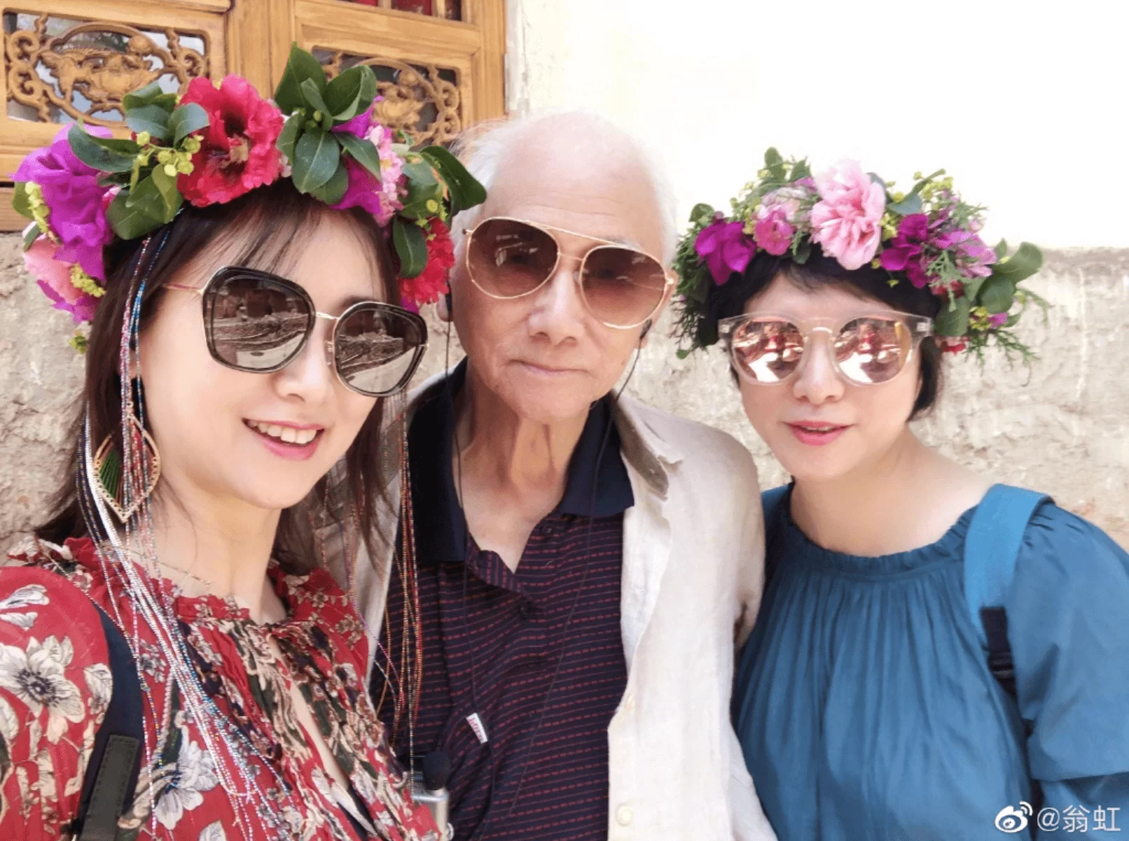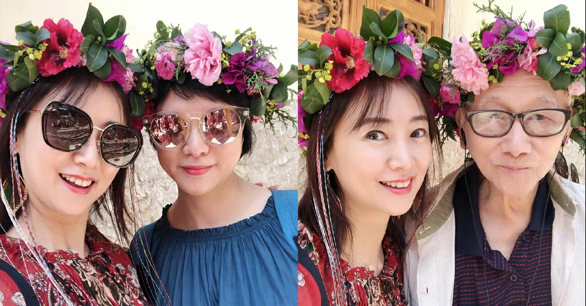 而擁有一顆少女心嘅翁虹,見到美麗花頭飾亦忍唔住戴上拍照,佢寫道:「天氣依舊陽光明媚,我們也入鄉隨俗來個大變身!老爸意外的很配合隨我裝扮,最後還是給他來了個大換裝。」