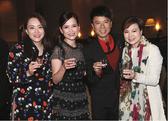 克勤入行三十年首奪男歌手金獎,Mani、英皇娛樂集團行政總裁許佩斯和商業電台總經理陳靜嫻在慶功宴上祝酒。