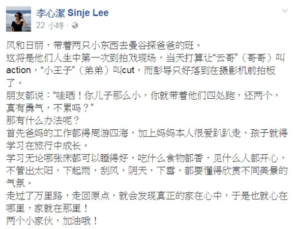 今年40歲的金馬影后李心潔和「鬼才」導演彭順結婚6年,雖然婚姻曾經面臨過難關,但她仍然樂觀面對這段關係,自從去年初宣佈懷上雙胞胎之後,在7月生下了雙胞胎兒子,近日她亦帶著兒子們到泰國曼谷探丈夫班,她更說︰「這將是他們人生中第一次到拍戲現場,當天打算讓"雲哥"(哥哥)叫action,"小王子"(弟弟)叫cut,而彭導只好落到再攝影機前拍板了。」胞胎兒子走過了萬里路之後,她又說︰「走回原點,就會發現真正的家在心中,也就是心在哪裡,家就再哪裡」令網民大為欣賞。