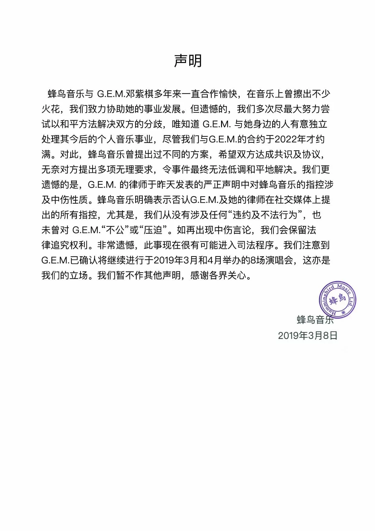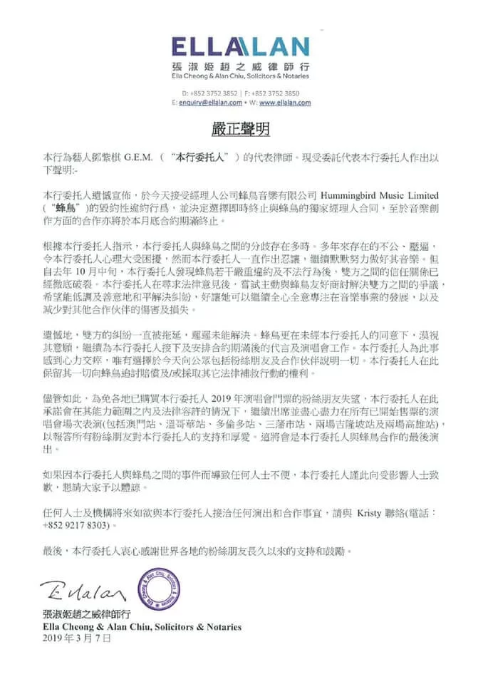 根據其委托之律師行在聲明上指,G.E.M.決定解約因為與「蜂鳥」存在分歧多時,其中又提到G.E.M.多年來受公司存在的不公、壓逼,令心理大受困擾。