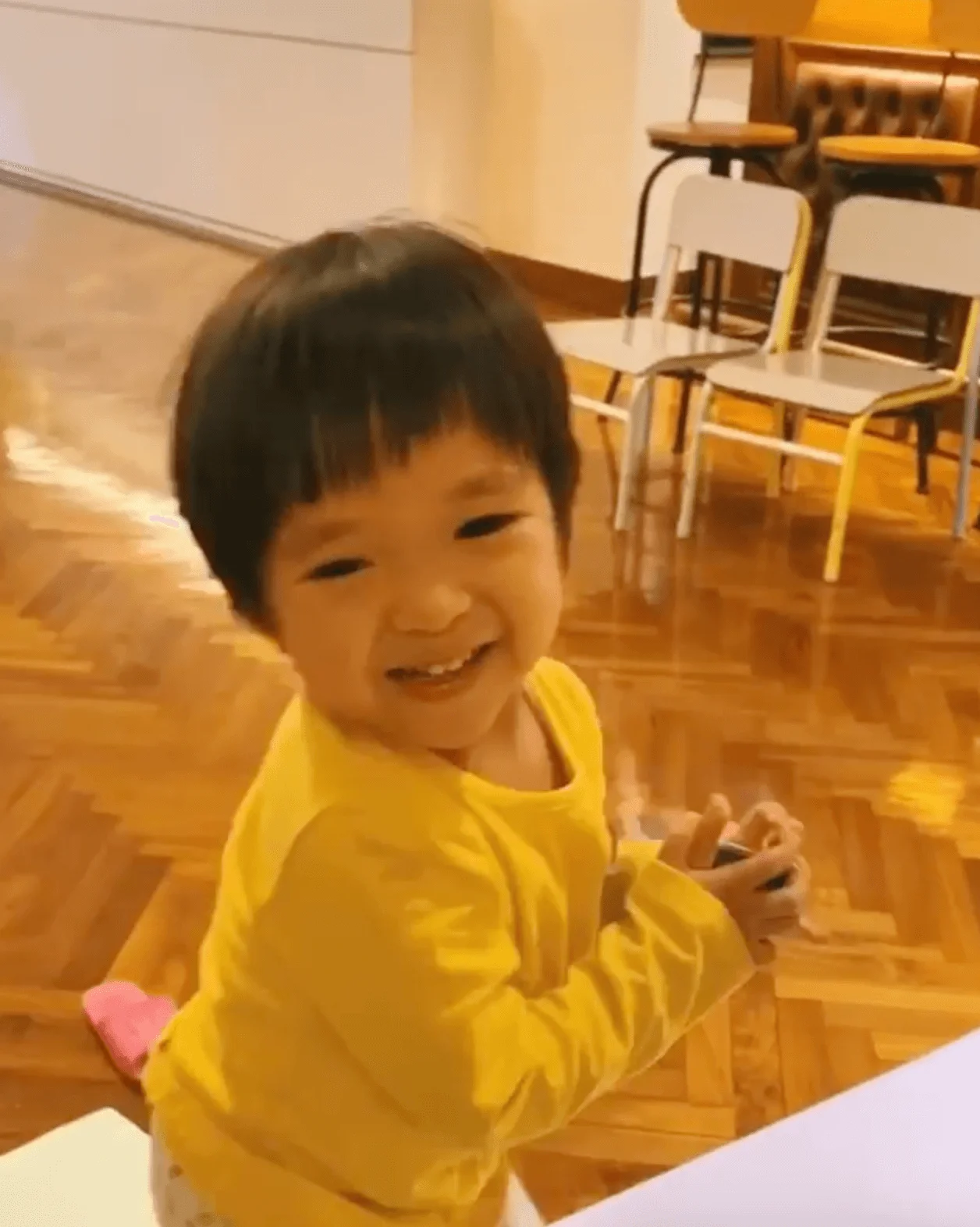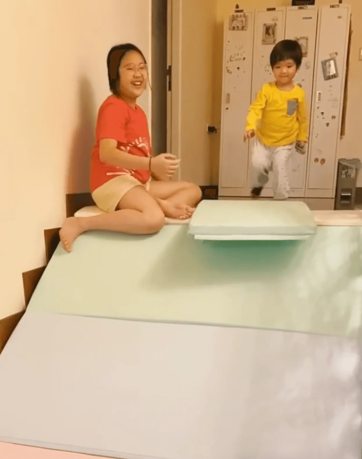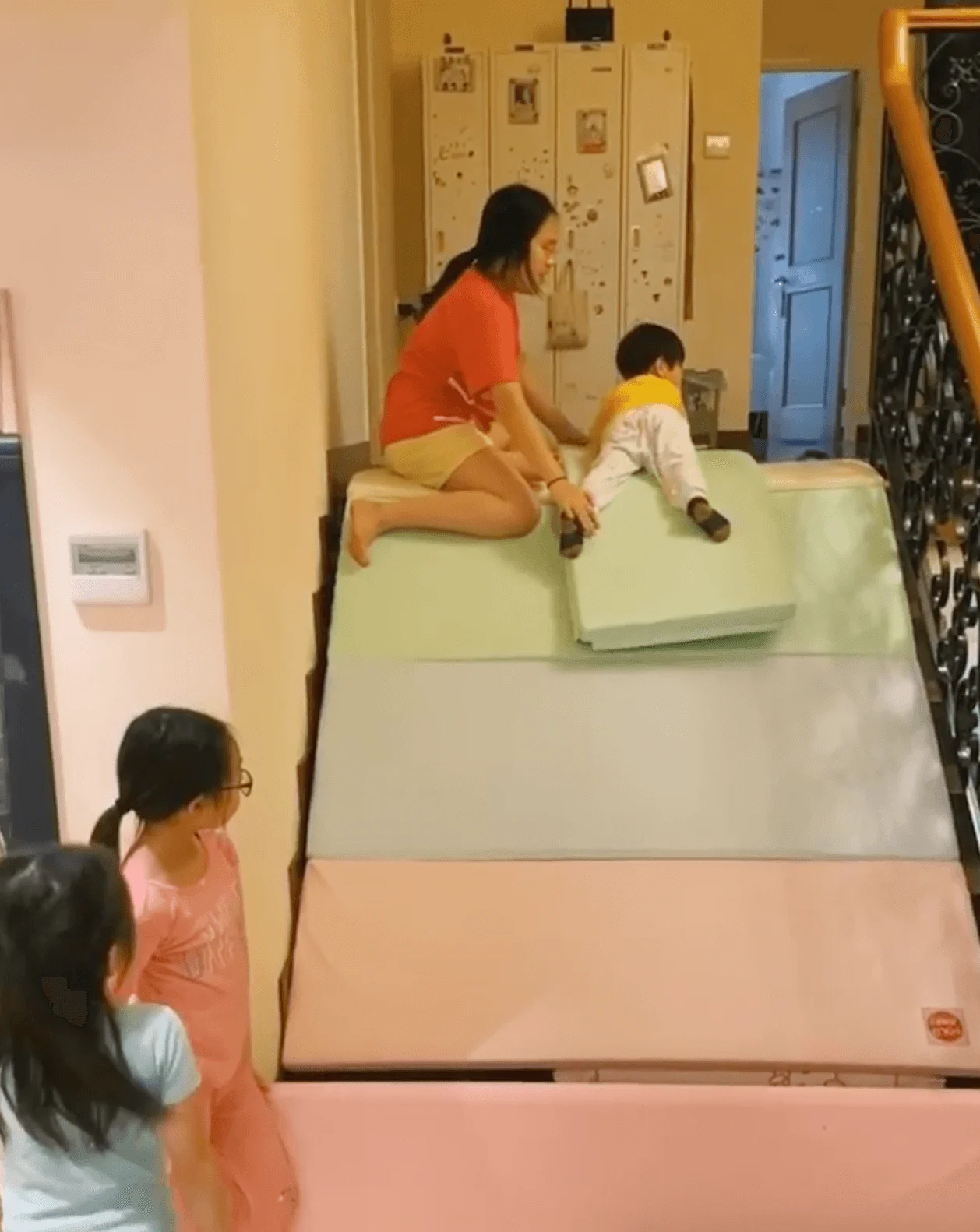 片中見小朋友在樓梯放了軟墊,而大家姊霏霏就擔當「定海神針」坐實軟墊,讓弟妹玩瀡滑梯,相當有愛!細佬Jaye從滑梯滑下,表現得非常興奮。