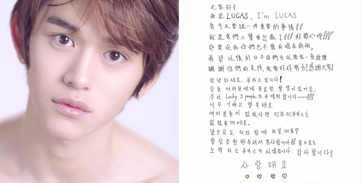 繼Jackson@GOT7、Elkie@CLC、ViVi@本月少女後,正式出現第4位港產韓星黃旭熙(Lucas)!Lucas是1999年香港出生的韓國偶像練習生,在香港長大的他加入韓流巨頭SM娛樂公司,於去年4月正式被SM公開身份,以準藝人姿態參與拍攝韓團NCT成員Ten的歌曲《夢中夢》MV,令人期待Lucas的出道。事件醞釀逾9個月,Lucas終於在昨晚以中韓雙語手寫信公布出道喜訊!成為SM首位出道的香港藝人。