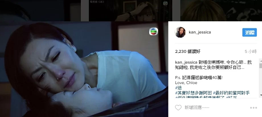當中飾演女兒的簡淑兒又在instagram說︰「對唔住啊媽咪,令你心碎…我知錯啦,我走咗之後你要照顧好自己…」佢仲搞笑有遺言:「記得攞返(番)爹哋嗰40萬!」