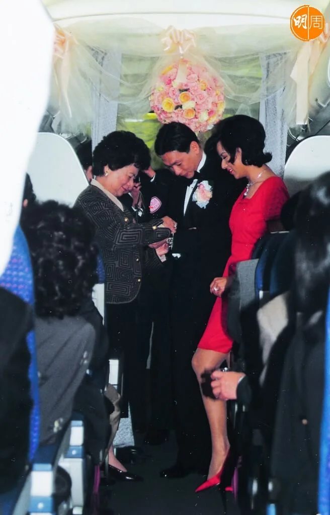 當日被邀登上這架訂婚專機的客人有一百多位,李美鳳只請了母親,從美國專誠飛來的哥哥和妹妹,及一位由中學已認識的好友,另外有十多位是二人共同的好友,其餘則是男家親友及傳媒;機艙布置得非常浪漫,頭等機艙前後的門廊上,都掛上粉紅粉橙的花球和薄紗絲帶,一對新人亦悉心打扮,李美鳳穿上一襲及膝紅裙,明艷照人,未婚夫則是一套黑色禮服。