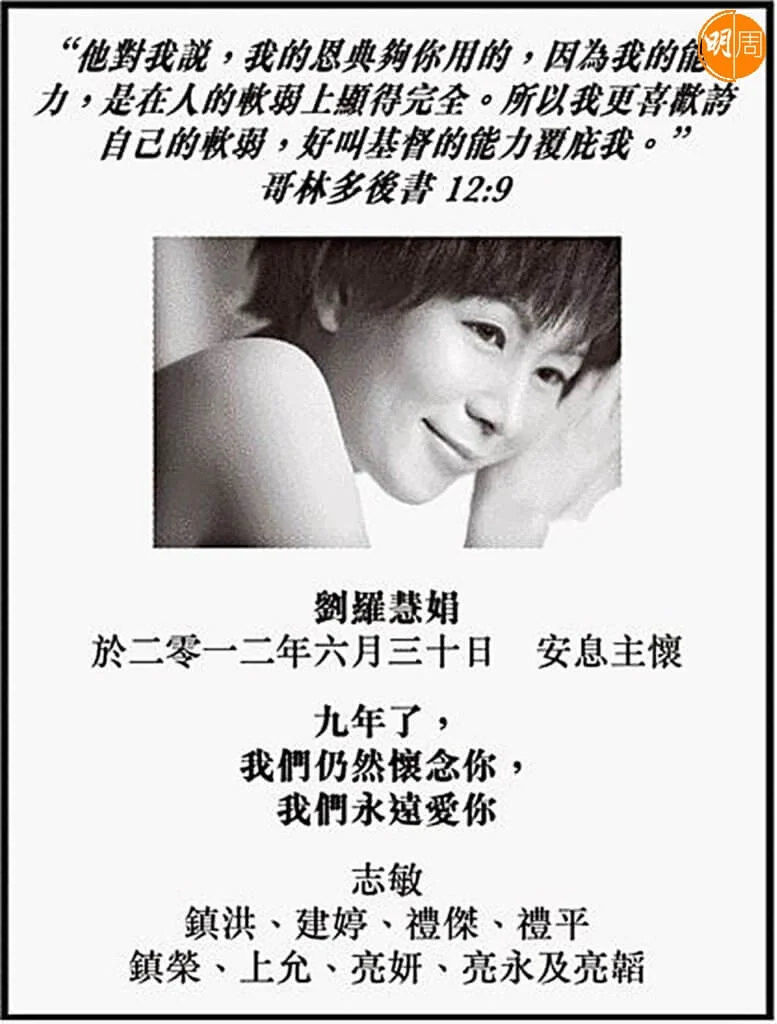 娟妹的喪禮在新加坡舉行,圈中好友如黎美嫻、陳法蓉、張衛健等,都趕到當地與她告別,遺體火化後由丈夫送回香港,並在香港舉行追思會,劉志敏透露將來會與愛妻合葬,永遠伴在至愛身旁;娟妹生前錄下八分鐘遺言,在喪禮上向親友一一告別,並回顧人生經歷,希望將信仰帶給她的盼望與至親好友分享,寄語大家不想人生有遺憾,就要好好生活,好好去愛,不要給自己有後悔的機會。
