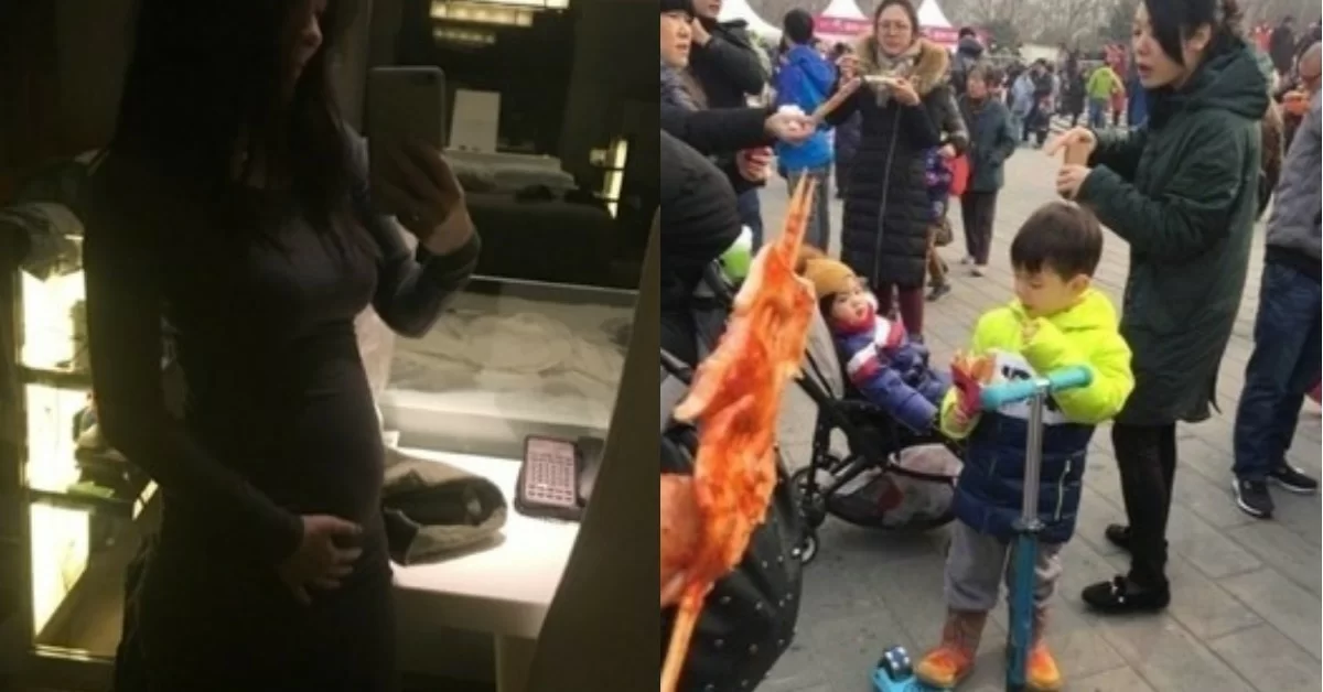左:霍思燕2016年凸肚照片 右:內地網民拍到嗯哼、媽媽與BB車