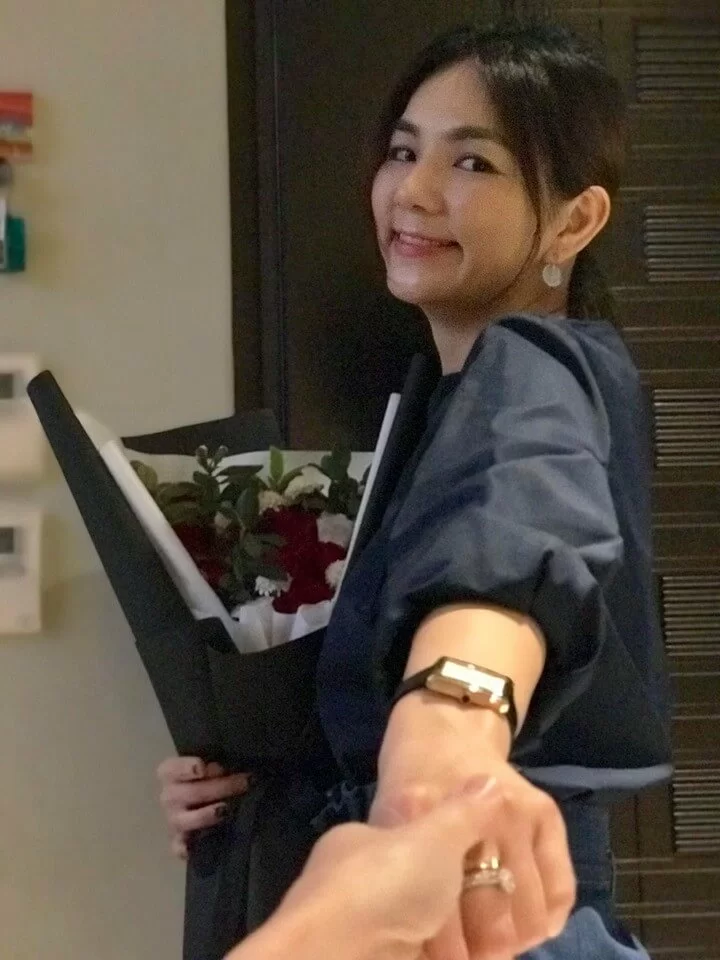 唔少女士都鍾意收花,Ella見到大束玫瑰後,即冧到嘟哂嘴,佢甜蜜留言:「一早就收到花,還以為是誰,就是老公本人。永遠都用花這招,而我真的很吃這招,周年紀念大餐是一定要的,老夫老妻了但還是要過一下。」
