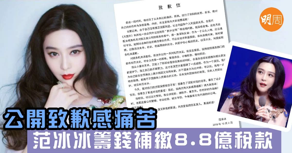 大陸稅務機關首度正式公布內地當紅女明星范冰冰逃稅案調查結果,確認她需補繳8.8億人民幣,只要在期限內繳清罰款,但若超過期限不繳納,將依法移送公安機關處理。對於逃稅事件范冰冰首次作出回應,並公開致歉信,對於她的所作所為深感羞愧、內疚,向大家誠懇道歉,亦會完全接受稅務機關的處罰。