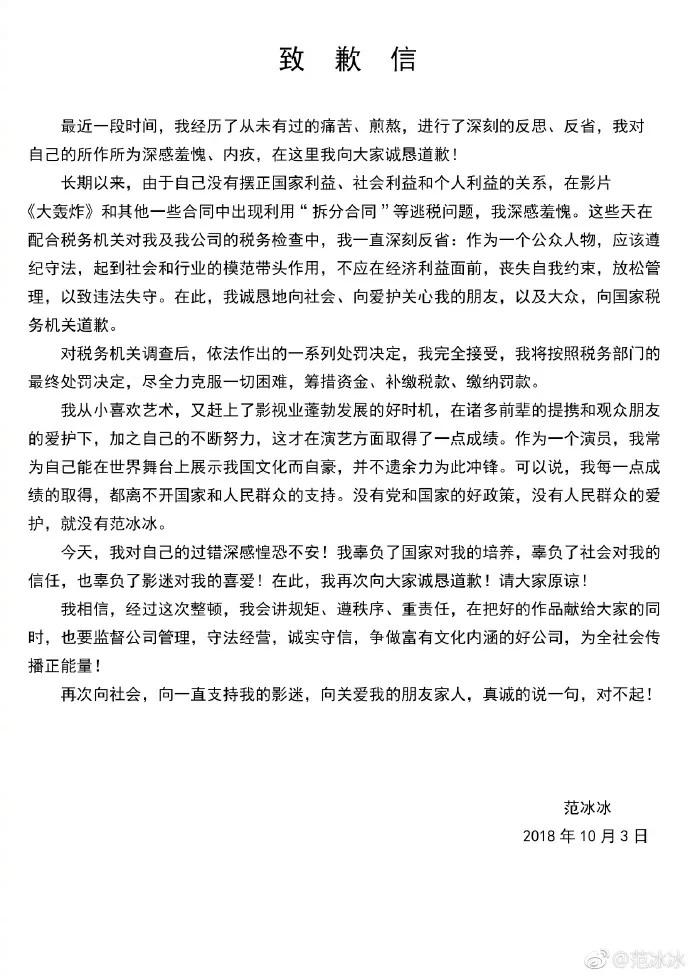 范冰冰在致歉信中提到:「最近一段時間,我經歷了從未有過的痛苦、煎熬,進行了深刻的反思、反省,我對自己的所作所為深感羞愧、內疚,在這裡我向大家誠懇道歉。」她在信中表示會完全接受稅務機關的處罰,「盡全力克服一切困難,籌備資金、補繳稅款、繳納罰款。」她表示日後定會守法,重責任,再三希望外界可原諒她的過失,結予她向社會傳播正能量的機會。