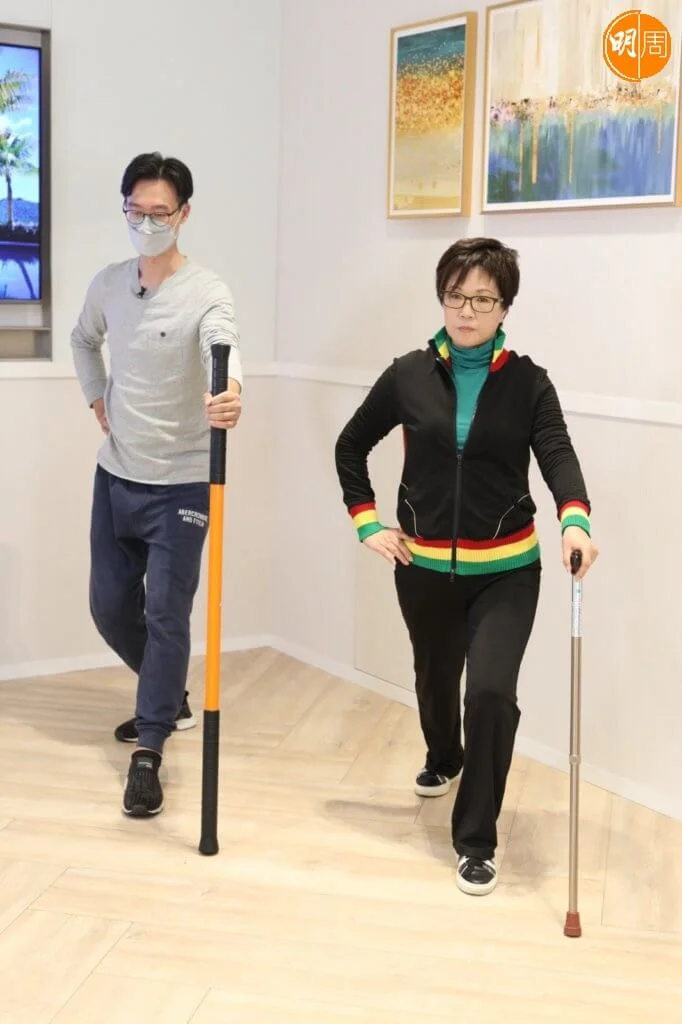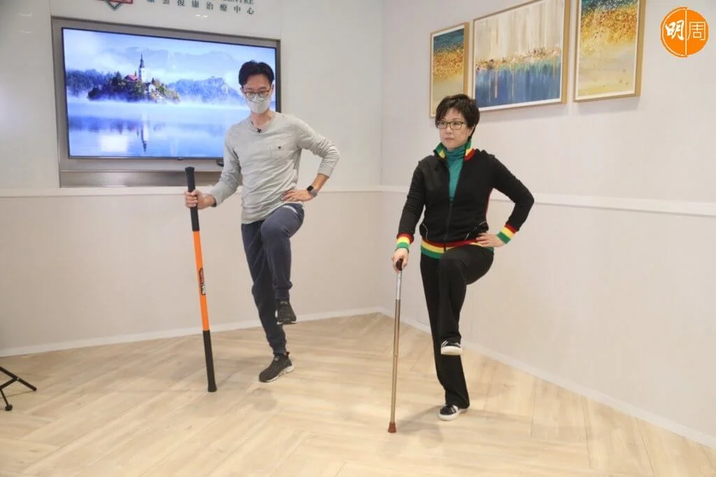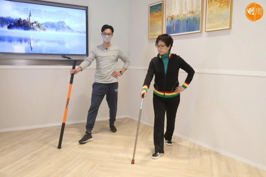 身體有平衡感,可以減低跌倒風險,右手持棍放右邊,收腹將重心傾向右邊,左腳向後大踏一步,腳踭踩緊地面重心移向後,然後再站直,重複做十次,然後轉換左手持棍,右腳向後踏步。