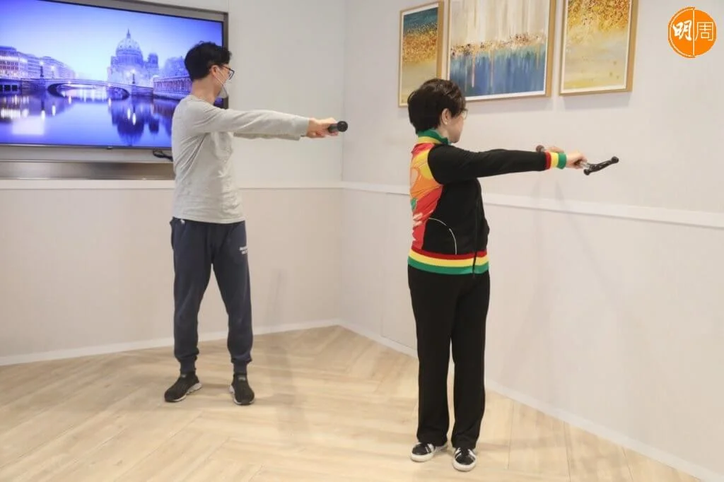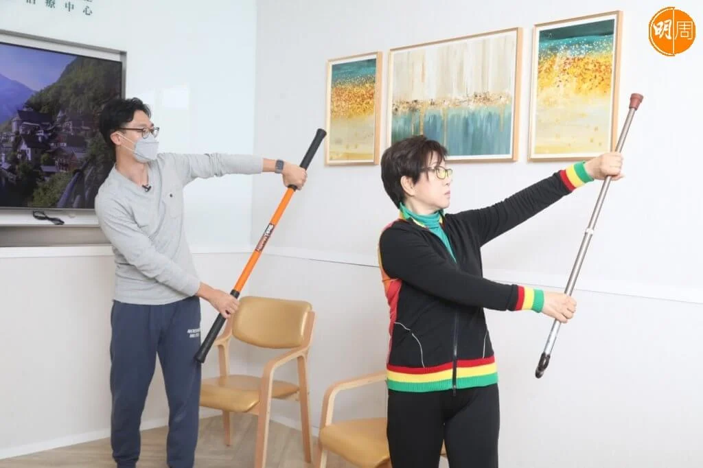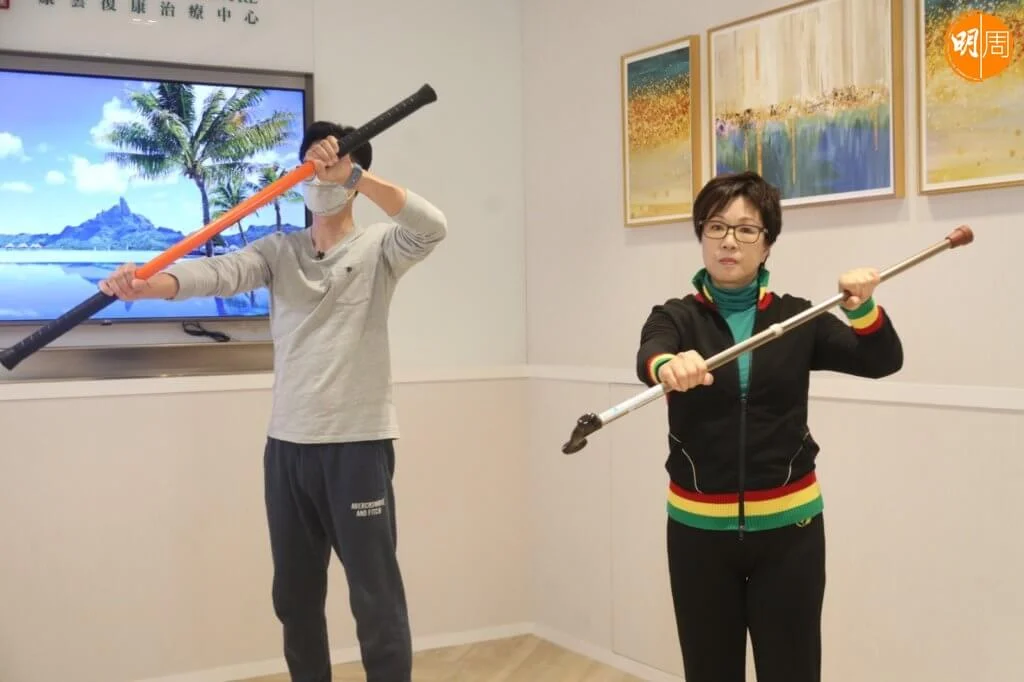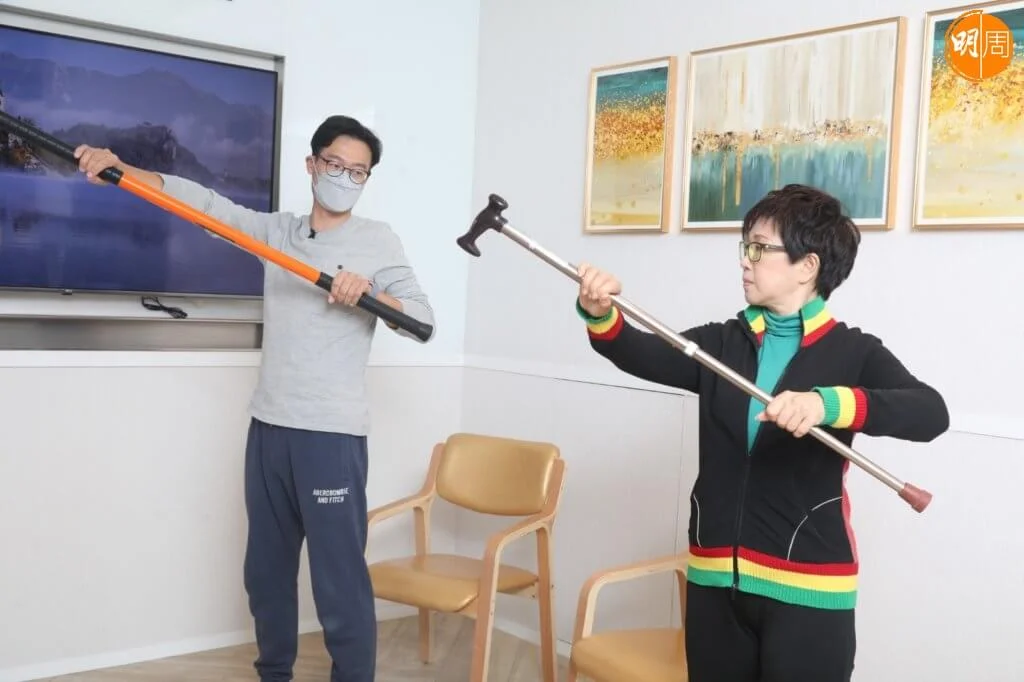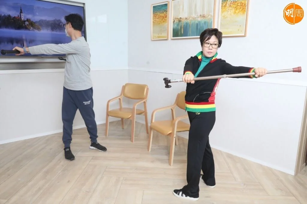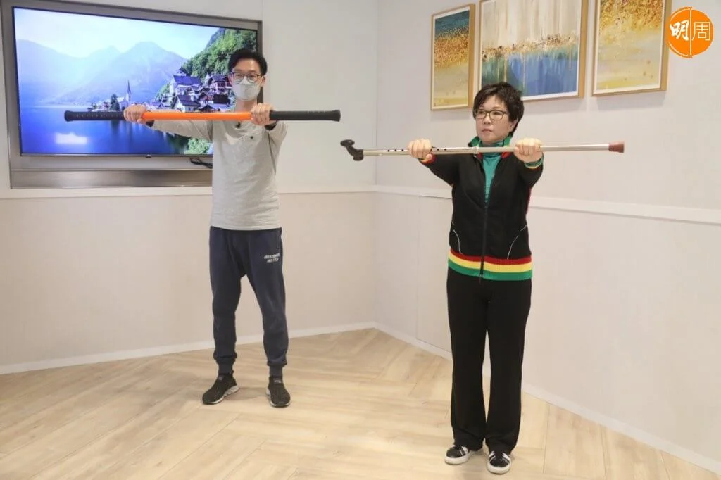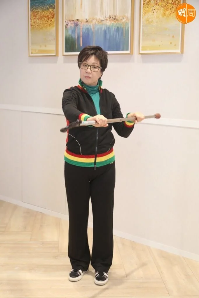 上肢關節運動,可以促進血液循環,預防肌肉萎縮,同時令感官系統保持靈敏度,如果家裏沒有長棍,可以用枴杖、丫叉或長遮代替:雙手持長棍放前方,左右手以打圈方式前後轉動,右手伸直時左手屈曲,感覺肩關節、手踭關節、手腕關節,都在重複伸縮活動,重複十次後轉換方向,右手屈曲時左手伸直,同樣以打圈方式前後轉動,做這個動作時要注意,身體保持穩定不要扭動,集中進行上肢關節活動。