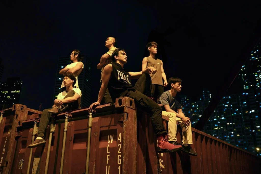 龐景峰與自組的武打團隊部分成員合影,個個身手了得,輕輕鬆鬆就爬上貨櫃。