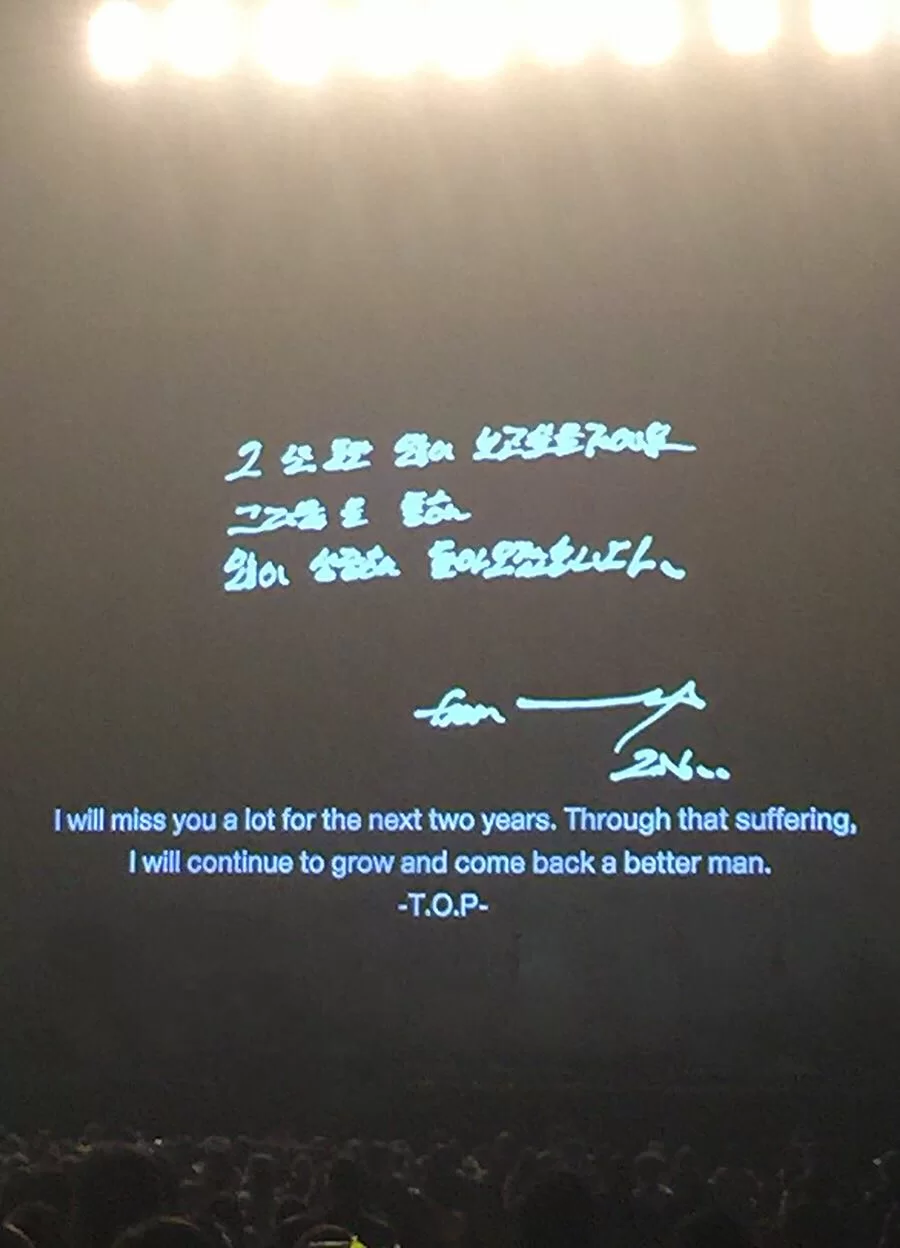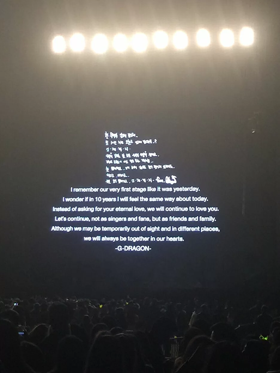 T.O.P今次完騷後就要入伍,唱完兩首情歌《If You》和《Last Dance》之後,太陽感性的說:「過去10年是他人生最美麗的日子,雖然我們要離開一陣,但我相信這關是可以過去的,相信你們會等我們,我們也會等你們。」而T.O.P.則說:「今次是很特別的演出。0 to 10表示我們已經在一起10年了,一齊慶祝吧!」演唱會期間,GD在勝利耳邊狂飊海豚音,而太陽狂搖勝利,這幕整蠱畫面引起台下哄笑。