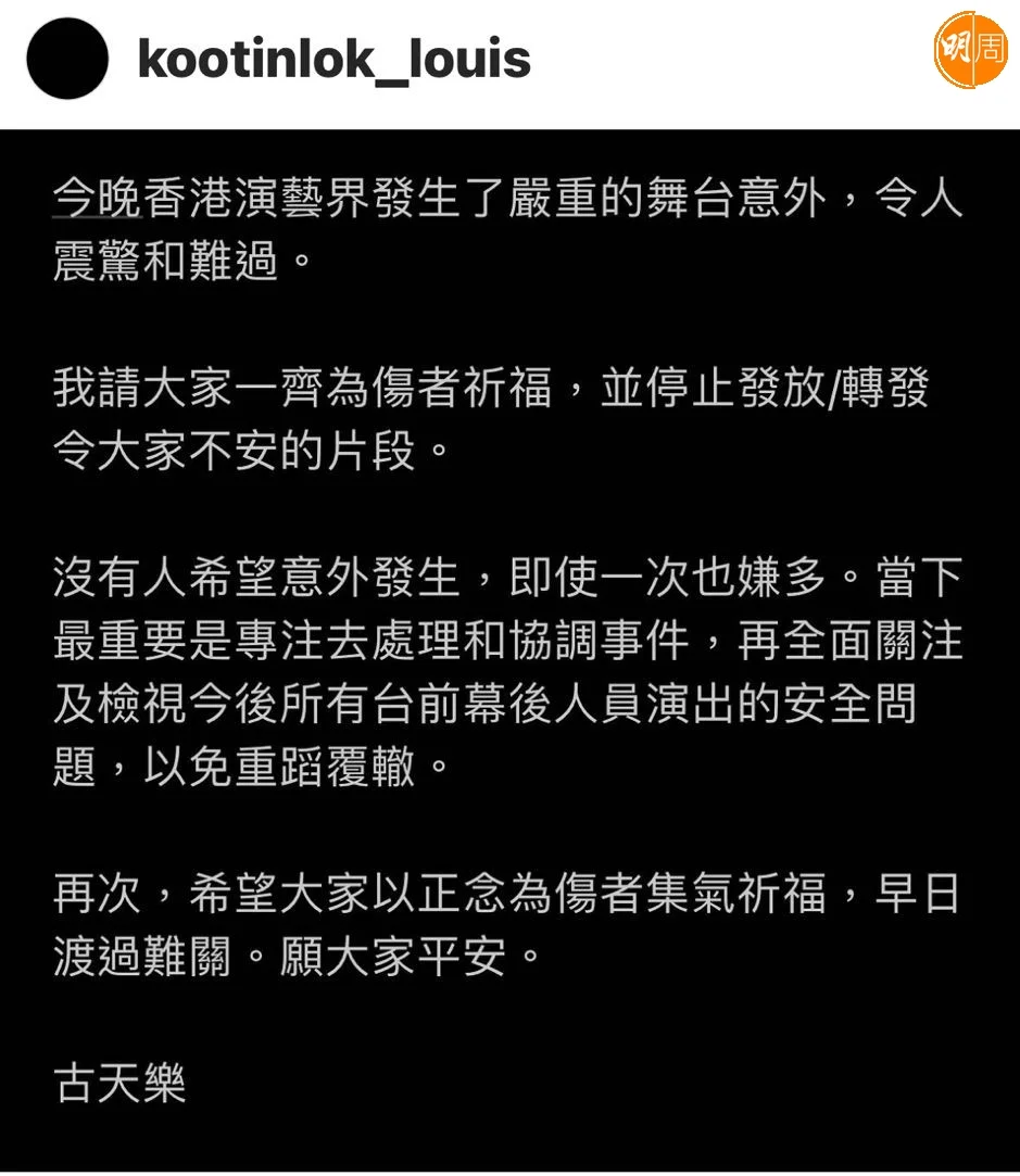香港演藝人協會主席古天樂,於凌晨時分發文稱:「今(昨)晚香港演藝界發生了嚴重的舞台意外,令人震驚和難過。我請大家一齊為傷者祈福,並停止發放/轉發令大家不安的片段。沒有人希望意外發生,即使一次也嫌多。當下最重要是專注去處理和協調事件,再全面關注及檢視今後所有台前幕後人員演出的安全問題,以免重蹈覆轍。再次,希望大家以正念為傷者集氣祈福,早日渡(度)過難關。願大家平安。」