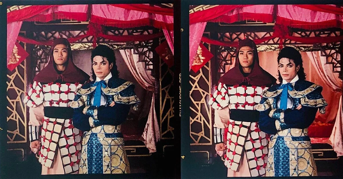 她說,MJ要拍攝一輯扮演皇帝的相片,需要一位扮演中國將軍的男模特,你是否願意幫忙?這真是突如其來的美夢成真。當時年少,一切事物都如此新鮮,而且自己竟然即將可和偶像合照!我毫不猶疑,一口答應了。我首先被安排到服裝間換上一套威武的將軍服,然後再到化裝間,讓化妝師為我的面部輪廓化得更乾淨俐落。幫我裝扮的同事無一不為我能與MJ工作而替我感到高興!當我步進MJ拍照的範圍──那是TVB的室內古裝廠,我的心臟一下一下地劇烈撞擊著,幾乎快要跳出來了。透過門口旁邊的磨砂屏風,我看到了他,我的偶像。MJ沒有戴太陽眼鏡。這一次,我清楚看到他的眼睛。大概是MJ看到我一身裝束,明白我是和他合作拍照的藝人,便以對待同事的態度向我點頭微笑,我也以專業的姿態回應MJ。這剎那的眼神接觸,就如電光石火的一瞬,是那種永遠烙印在腦海的Kodak moment!我盡量控制著自己的狂喜,一再告訴自己:我在工作,要冷靜,要冷靜。我轉身呼了一口氣,幾乎窒息。他拍完幾張測光的polaroid後,工作人員安排我們正式介紹,他跟我握手的一刻,電擊從我的手掌奔向心房,那種感覺至今仍未能忘懷。他的手掌很粗燥,很結實,感覺很像我在加拿大讀書時結識的黑人同學死黨,讓我感到莫名的親切。