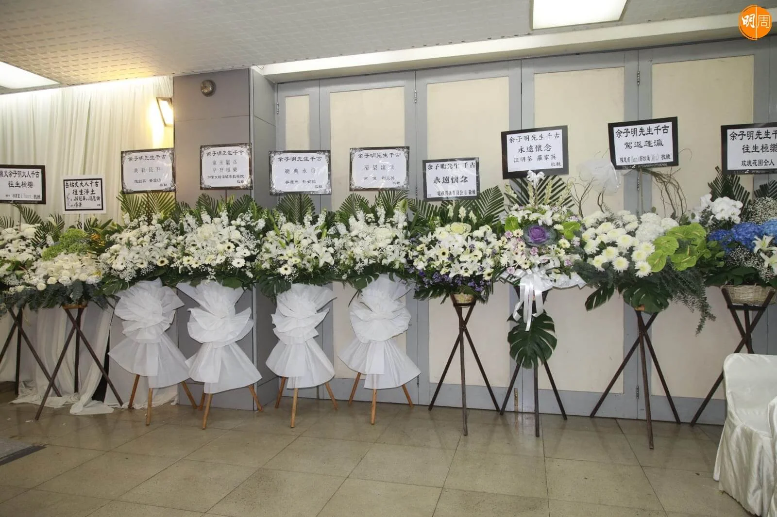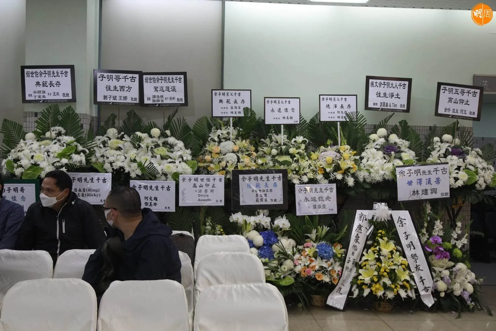 靈堂放滿圈中藝人致送的花圈,到場藝人包括子明哥太太馮素雲的家姊馮素波,林家棟、徐榮、譚炳文女兒譚淑瑩、李香琴女兒蕭紫筠等,先後到達靈堂致祭送子明哥最後一程。