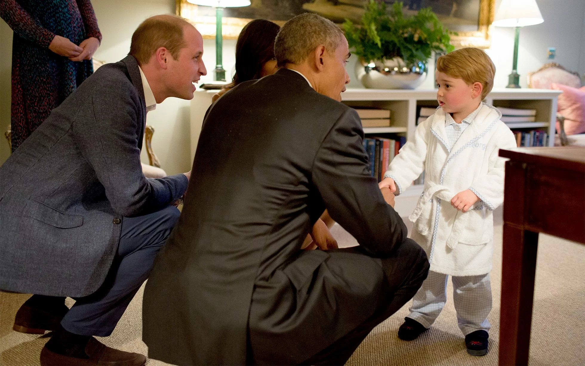3. 2016年4月,當時的美國總統奧巴馬訪英,到肯辛頓宮探望威廉王子一家,換咗睡衣準備瞓覺的喬治小王子,臨瞓前卻被父母帶去與奧巴馬見面,喬治小王子睡眼惺忪地跟對方握手,非常趣緻。