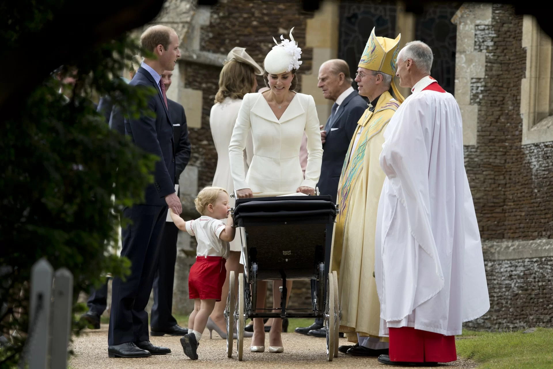 2. 兩歲多,快滿三歲的喬治小王子在2015年7月初,出席初生妹妹夏洛特公主的洗禮儀式。着住白衫紅褲仔的他非常雀躍,好用力趷高腳望下BB車內的妹妹,又走去同「太嫲」英女王傾計。