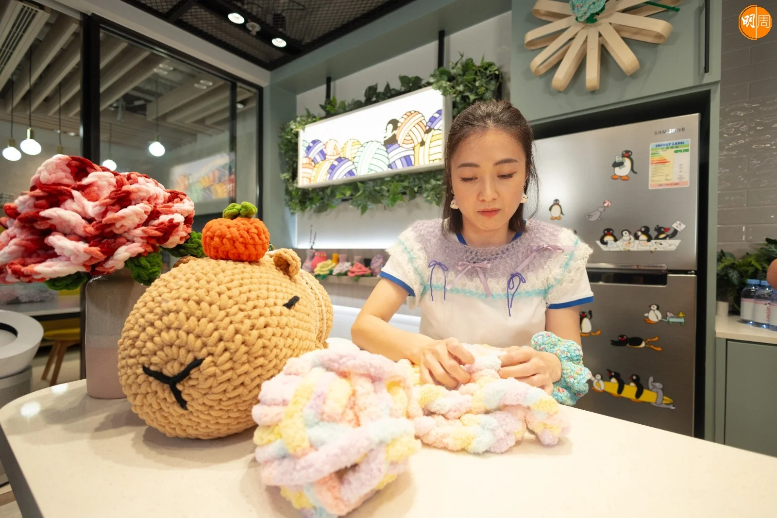 到達工作室後,混血肥仔就發現裏面有大量可愛鈎織擺設,當中更有不少是「屎形」精品,甘比向一臉好奇的混血肥仔解畫:「嚿屎其實有段古,我好朋友,其實係Sammi(鄭秀文),叫我織嚿屎就大受歡迎!其實屎喺日文叫『unko』,同好運發音好似,日本年青人好鍾意做一個屎形狀嘅手勢,其實係祝福嚟。」除了有趣擺設之外,工作室亦有不少加上「Handmade By Kimbee」小牌的鈎織手袋,混血肥仔一度以為它們售價不菲,但一睇價錢牌即忍不住說「比我想像中平好多喎」,甘比分享箇中原因:「開頭開鋪頭嘅時候,啲同事就成日話『唔得㗎,你織要賣貴啲』,我就覺得大家都織到嘅,就一定要同大家一樣嘅價錢。」