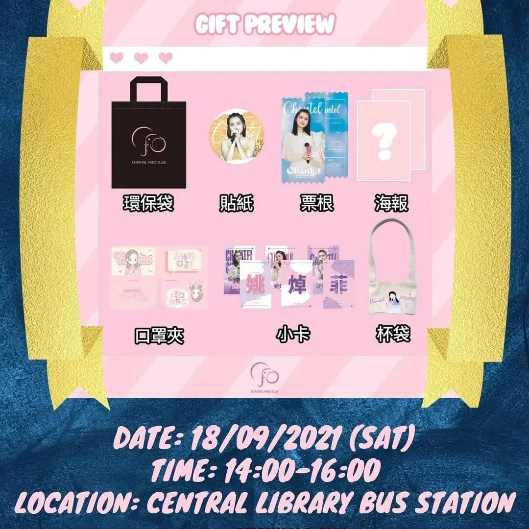 另外,Chantel Fans Club於今個周六(18/09)在中央圖書館外的生日燈箱對出空地,派發生日福袋,讓一眾「小菲象」打卡之餘,也有禮物收,而福袋內附貼紙、票根、海報、口罩夾、小卡、杯袋。