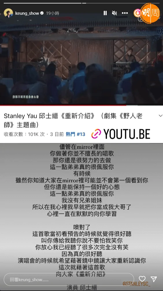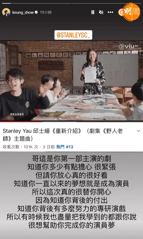 Mirror成員邱士縉(Stanley)在劇集《野人老師》首度擔正男一外,更是首次主唱劇集主題曲,好兄弟姜濤於昨晚(17日)在社交網連發兩則貼文力撐Stanley新歌好聽,又指身為獨生子的自己早就把對方當成大哥。他寫道:「哥這是你第一部主演的劇,知道你多少有點擔心,很緊張,但請你放心真的很好看。知道你一直以來的夢想就是成為演員,所以這次真的很替你開心,因為知道你背後的付出,知道你背後有多麼努力的專(鑽)研演戲,所以有時候我也盡量把我學到的都跟你說,很想幫助你完成你的演員夢。」