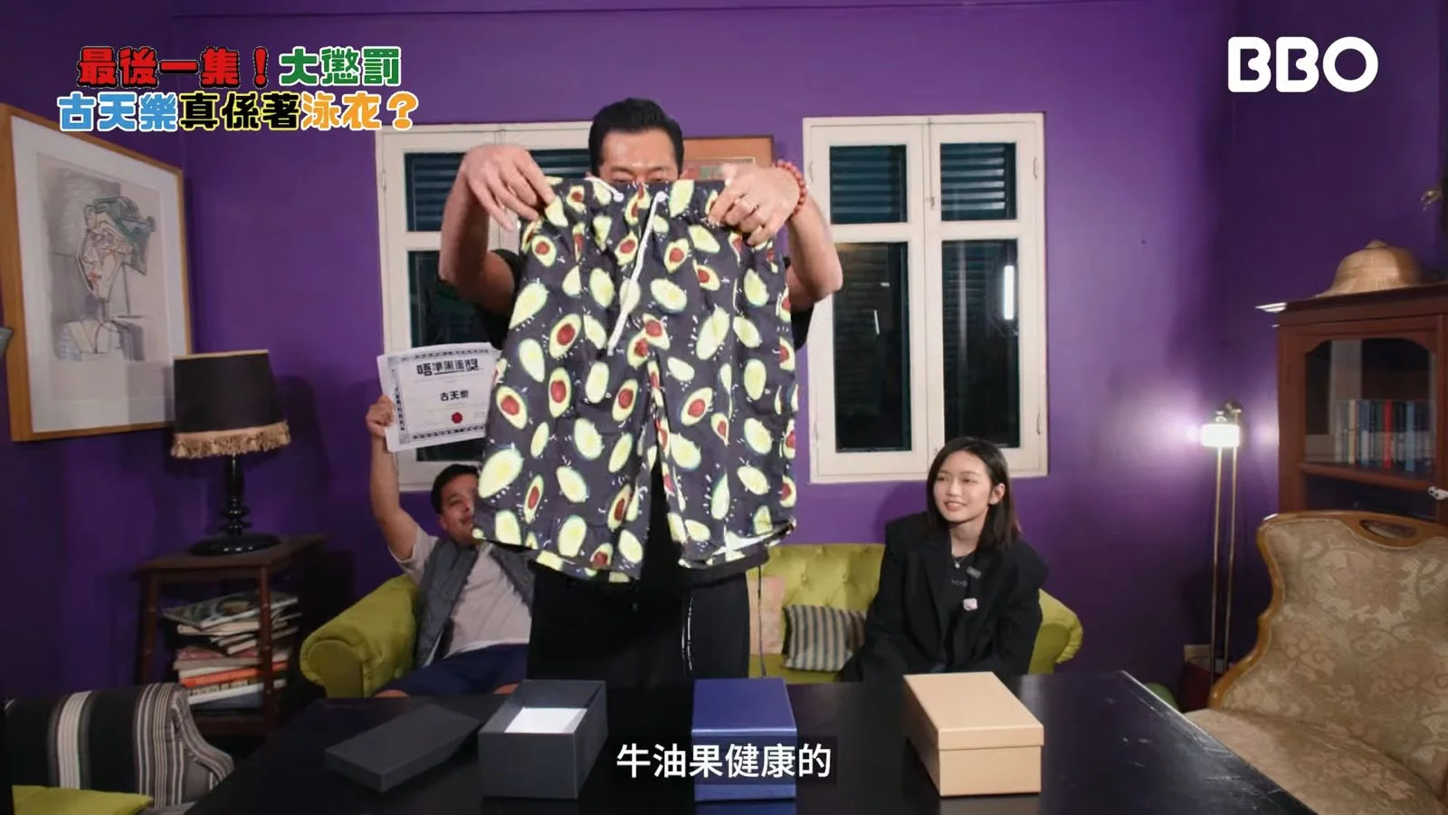 至於古仔就抽中了穿泳衣這個終極挑戰,混血肥仔等人安排了三款泳衣供他選擇,第一個選擇是沙灘褲,第二個選擇是滑浪防曬衣配三角泳褲,第三個選擇是一件頭連身平腳泳衣,結果古仔就揀了望落最多布的第三個選擇:「好吖,呢件啦!」現場見證的混血肥仔和丁丁立即企起來興奮鼓掌,丁丁更說:「古生做咗個英明嘅選擇!」