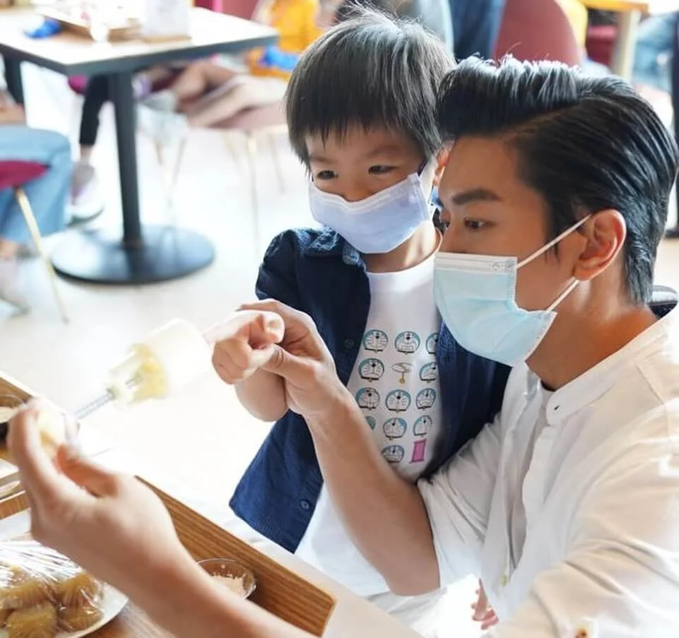 「型男廚神」黎諾懿最近推出全新飲食節目《滿足的味道》,帶觀眾走訪本地多間享負盛名的老字號,尋覓香港老味道。除了拍飲食節目他亦熱心公益,昨日他帶同5歲兒子「小春雞」黎峰睿一起做月餅。小春雞盡得爸爸真傳,雖然是第一次做月餅卻做得有板有眼,他先搓圓粉團,再細心用模具印成月餅,手勢得非常嫻熟! 令黎諾懿也不禁說:「