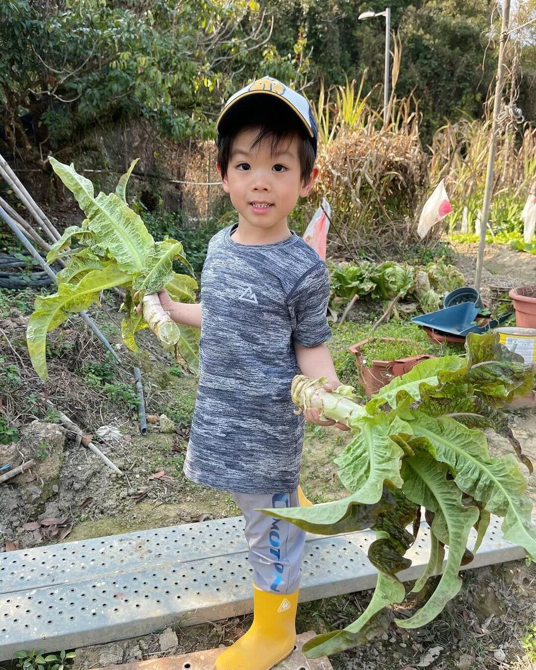 昨天(05/06),他帶同小春雞到果園摘荔枝,讓兒子體驗當小農夫的滋味,並說道:「小小農夫日,開心摘荔梭。」小春雞到處摘荔枝,收穫豐富,看見大樹菠蘿相當好奇,同時也有摘茄子,非常滿足。