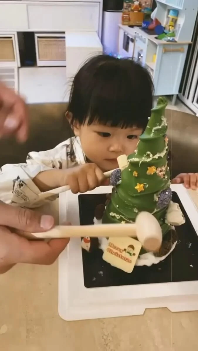 展鵬抱着小豬比唱着聖誕歌,然後讓她扑蛋糕,小豬比用木槌用力扑,非常興奮,見到囡囡玩得開心,展鵬爸爸當然也很滿足吧。
