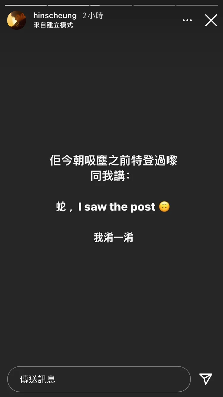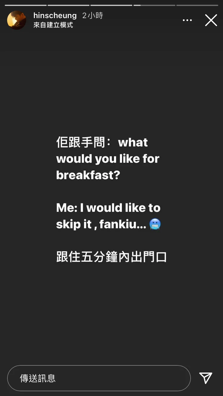 軒仔今日係Instagram Story 話遮遮朝早吸塵嘅時候,特登同佢講話見到佢個post,仲問佢嚟緊早餐想食啲乜。聽到遮遮咁問,軒仔即時反應都唔知點做好,唯有答遮遮呢日想唔食早餐,之後佢仲好淆咁係5分鐘內出門口。