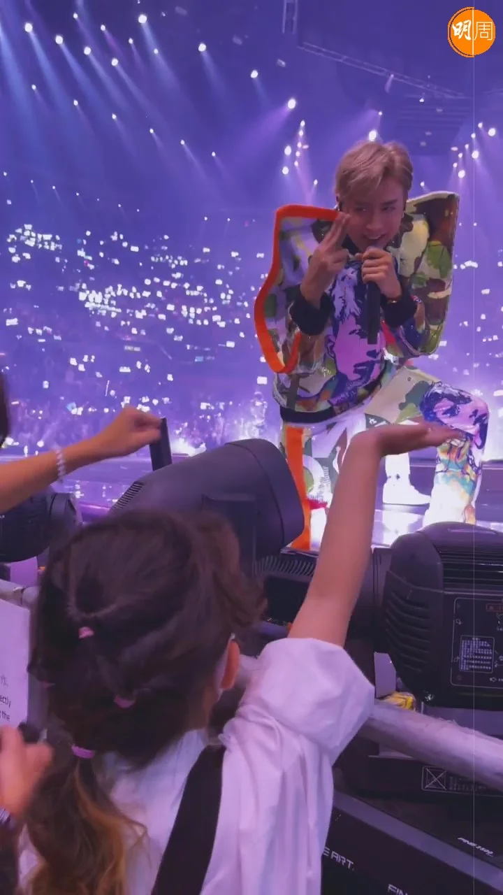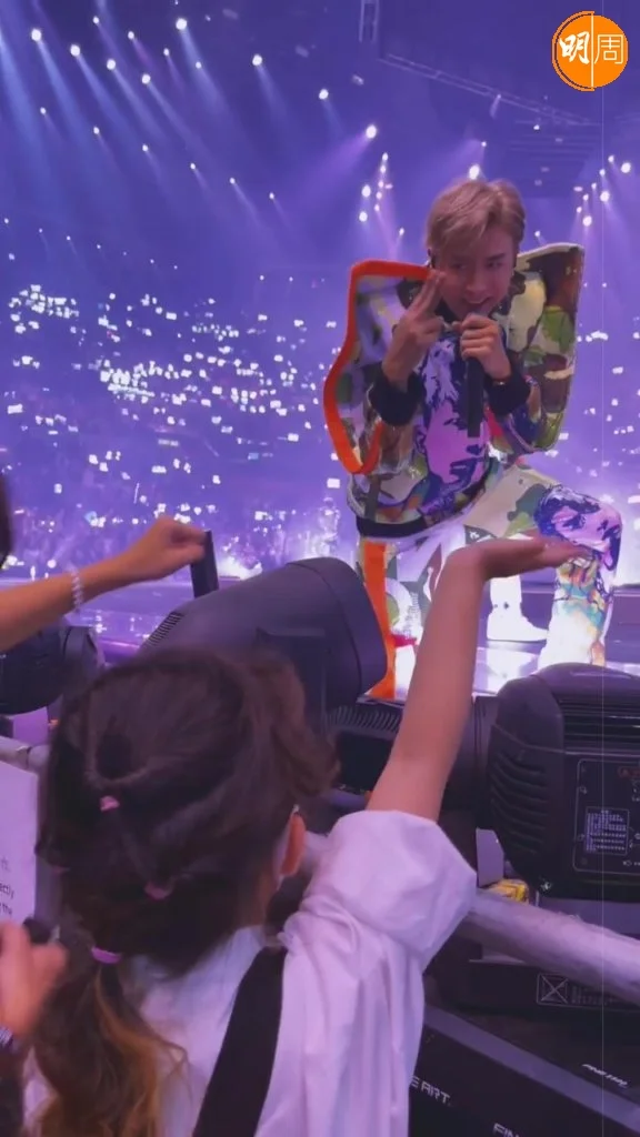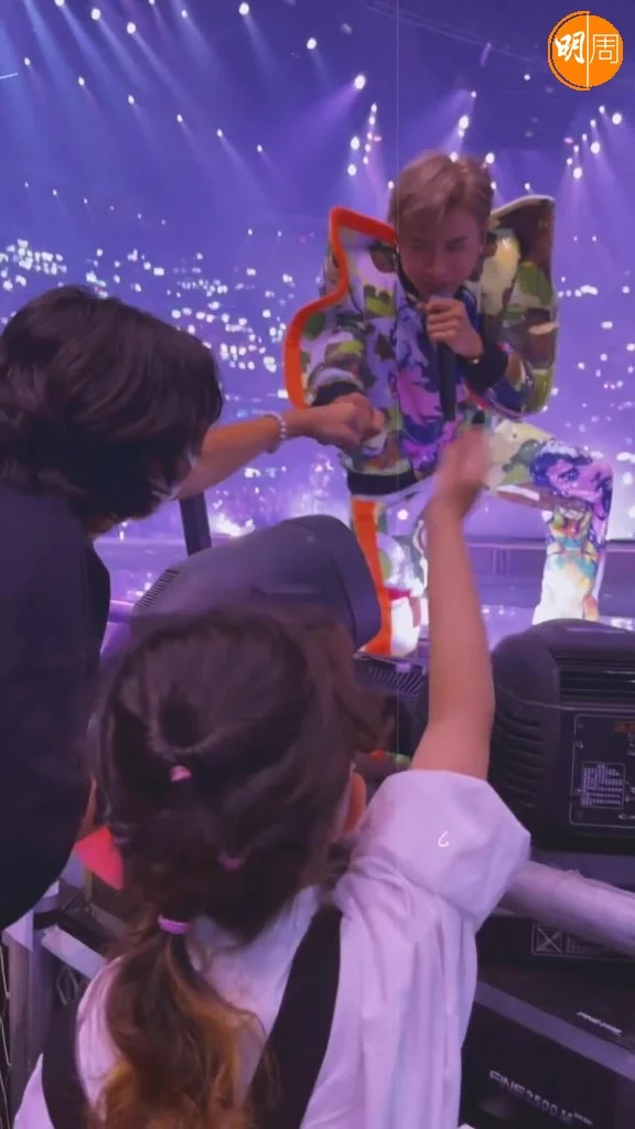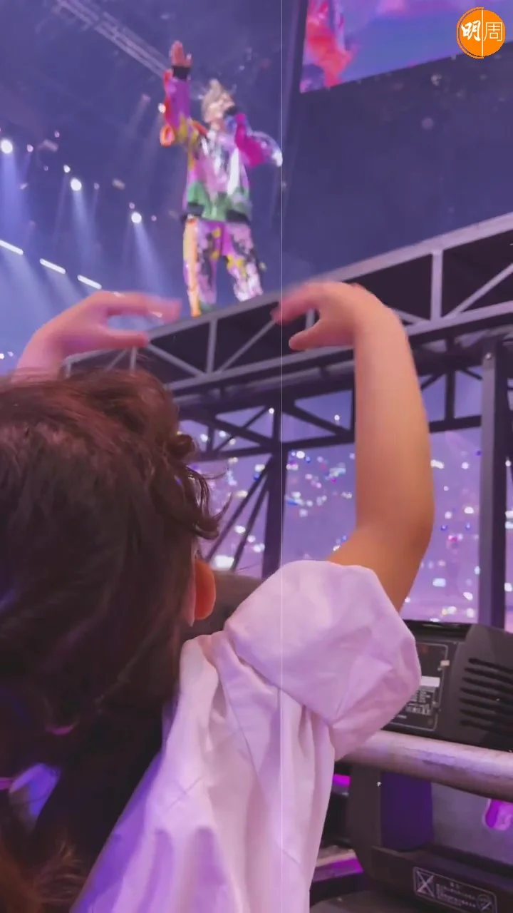 MIRROR紅館演唱會昨晚(25日)開鑼,汪明荃(阿姐)、鄭裕玲(Do姐)等都有入場睇騷,張繼聰與謝安琪(Kay)帶同一對子女更坐在最前握手位。張繼聰在社交網上載女兒張靖(Kakaball)在台下,期待已久終於等到台上的Anson Lo(AL)和Anson Kong(AK)在面前經過,作為神徒的Kakaball落力揮手,果然引起AL的注意,望向她揮手,Kakaball即時興奮得望向鏡頭,示意AL看到了她!然後AK更走上前,跟哥哥張瞻擊拳,及近距離同Kakaball打招呼,兩兄妹都超開心,難怪阿聰留言:「皆大歡喜」、「Kakaball表示冧晒」!AL亦在阿聰的帖文下留言,給小粉絲心心符號。
