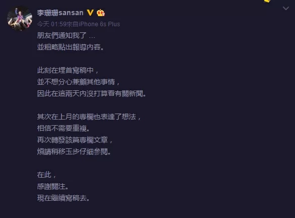 李珊珊對於報導在微博作出回應:「朋友們通知我了…,並粗略點出報導內容。此刻在埋首寫稿中,並不想分心兼顧其他事情,因此在這兩天內沒打算看有關新聞。其次在上月的專欄也表達了想法,相信不需要重複。」