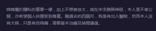 然後她又轉載在今年4月分所寫的專欄文章:「病情屬於隱私的重要一環,加上不想被放大,或在未來無限伸延,本人是不會公開,亦希望個人抉擇受到尊重。剛過去的四個月,我是有出入醫院,然而本人沒有大病,只是有些病痛,需要基本治療及時間康復。」