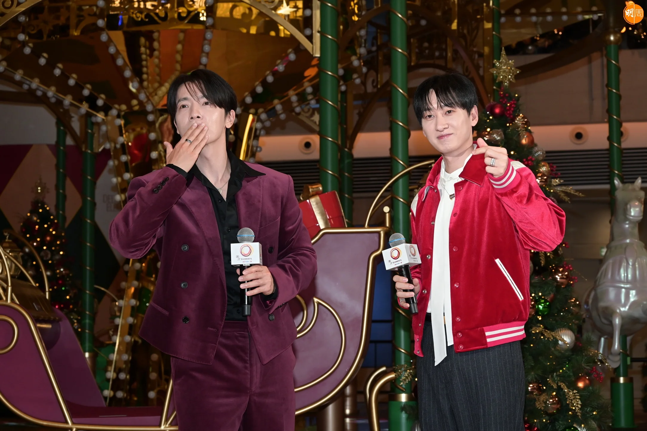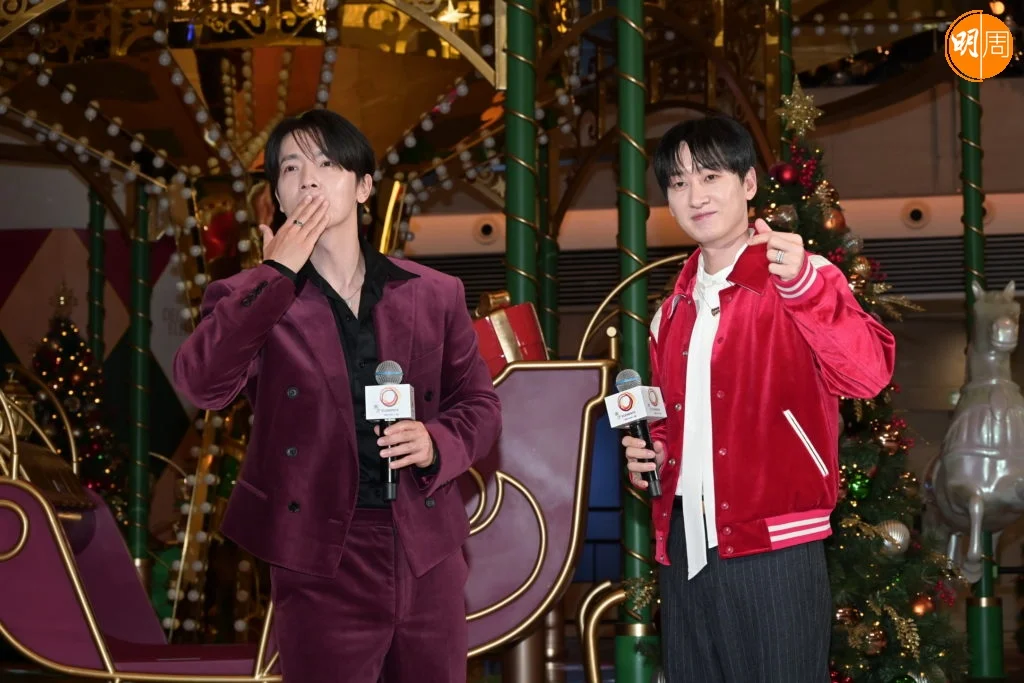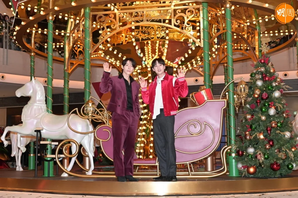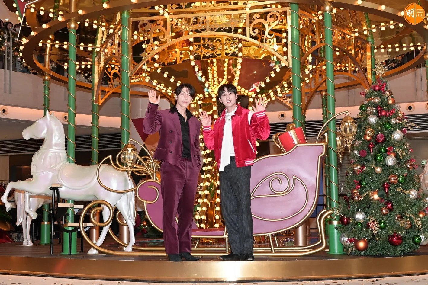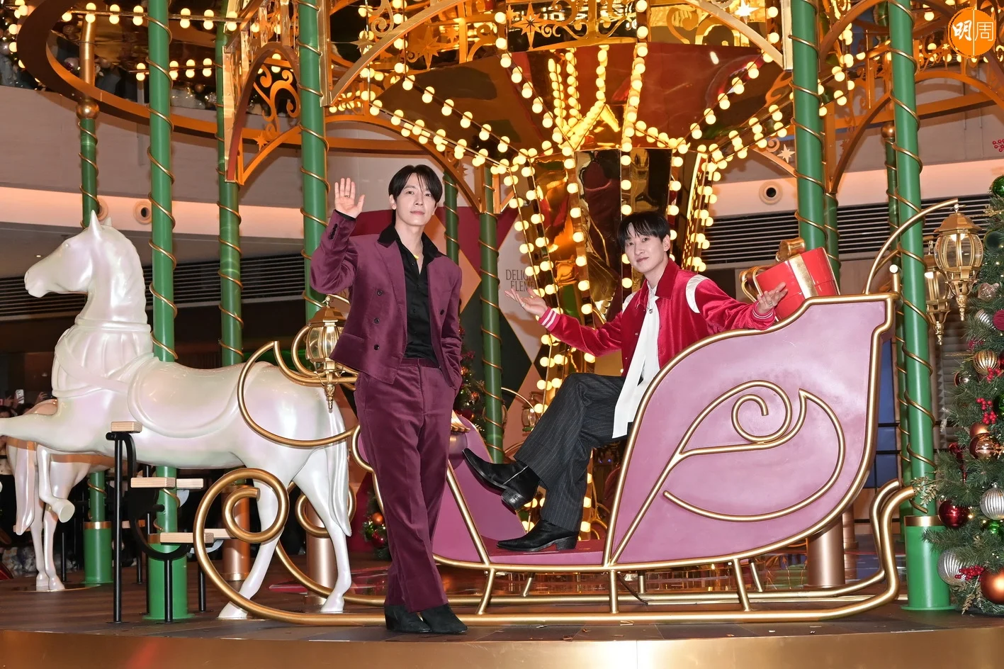 韓國男團Super Junior(SJ)小分隊Super Junior D&E兩位成員東海與銀赫,昨晩(9日)出席商場聖誕亮燈活動,兩人用廣東話打招呼又做出心心手勢及派飛吻。銀赫大讚商場很有聖誕氣氛,東海表示見到聖誕樹與燈飾,感到既開心又幸福。大會安排了3款地道美食,包括麵包布甸、叉燒包與雞蛋仔,他們即時學習以廣東話講出美食名稱,又試食雞蛋仔,然後用普通話大讚「好食」。談到明年工作大計,銀赫指SJ明年出道20周年,會與成員一起來港,東海透露有好多計劃,又會常常來港見粉絲,及抽空購物與品嘗美食,離開之前,兩人大嗌「我愛你」冧粉絲。