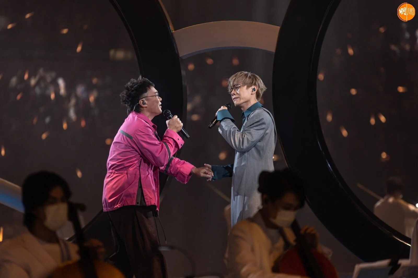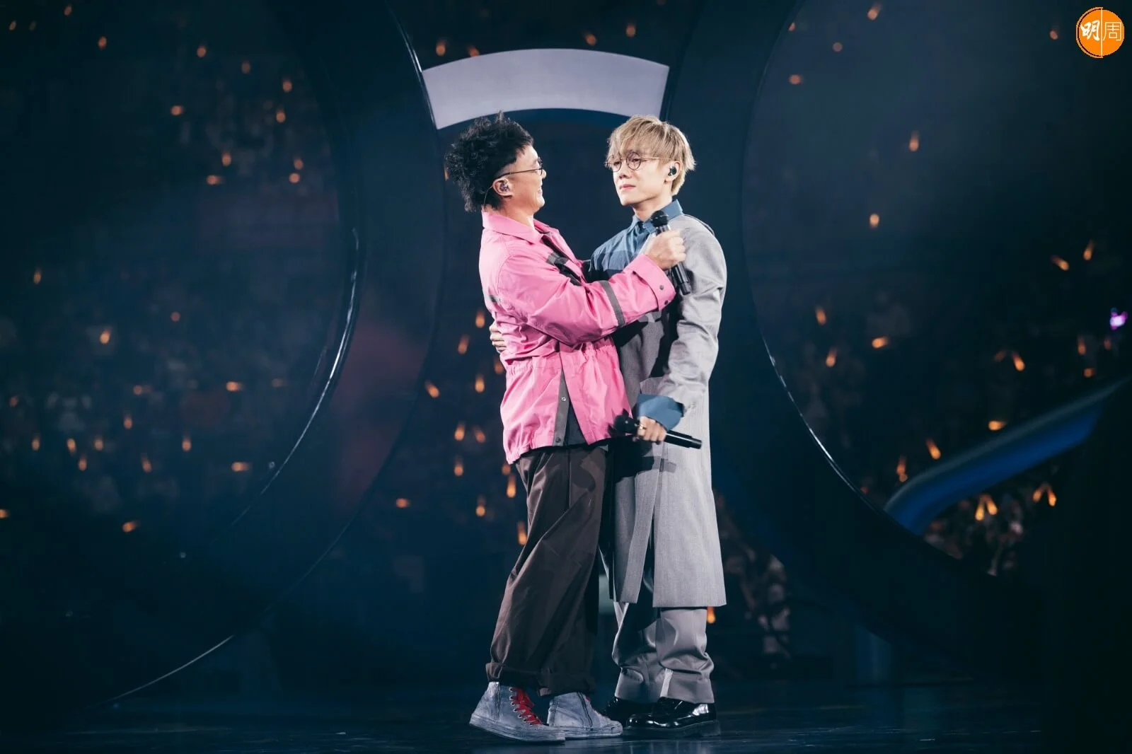 九年沒有登上紅館舞台的Eason,昨晚一身粉紅色,配上圓形眼鏡出現,先出場跟家謙合唱《致明日的舞》,之後他笑問家謙,「我呢個look正唔正?陳家謙呀。我特登搵個眼鏡跟你㗎!」接著他又說,自己於台底等待時,聽到家謙唱到有點咽哽,「你差啲搞喊埋我呀。真係好感動。」由於觀眾歡呼聲未曾停過,Eason也忍不住跟觀眾說,「你哋好正!」又即迎來巨浪歡呼。