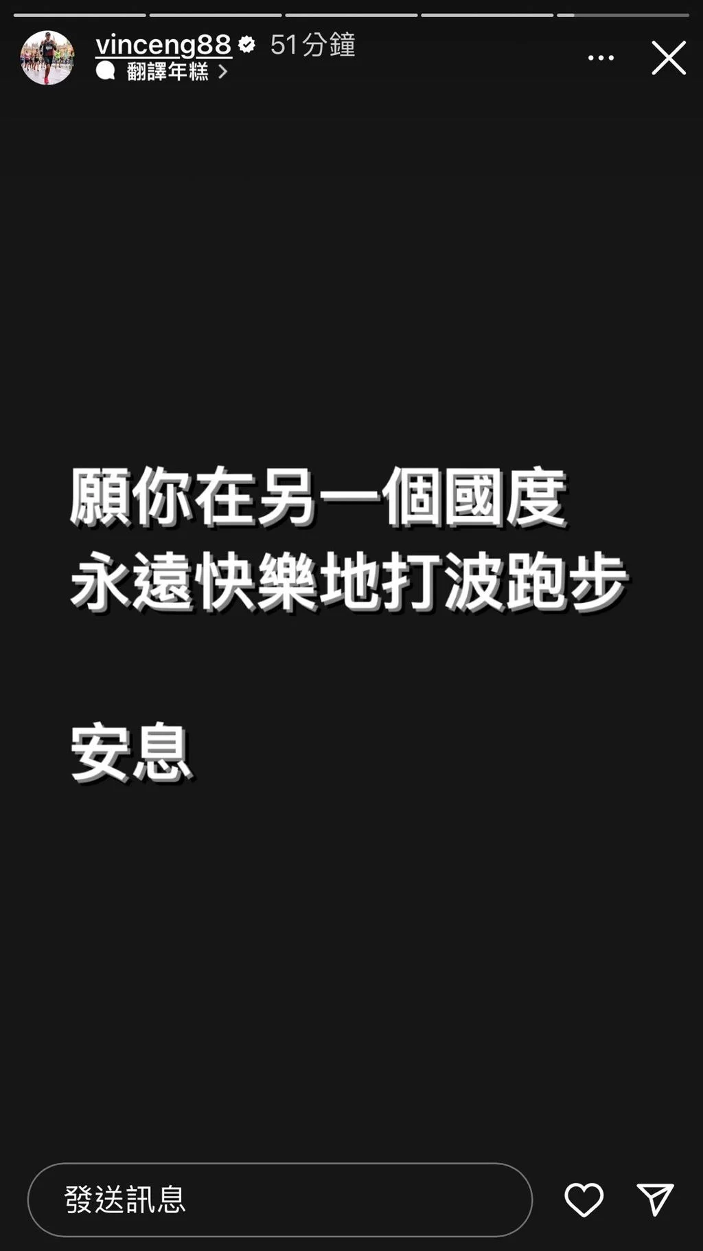 保錡又說:「還記得一天晚上我們一起說創立大埔民間體育會,感染更多人跑步,感染更多人正能量。這些事都像昨天發生,一起跑步聖誕節團聚,一起12月31號比賽,所有經歷都要美好的。大埔大王爺廟這條跑路,永遠是屬於柳爺的,沒有他我們沒有大埔民間體育會。我們會帶着你的精神繼續跑,唔會停唔會停唔會停。我只想說你感染了很多人,我真的被你改變了。我應承你我一定會繼續正能量下去,我唔會辜負你對我的好。」