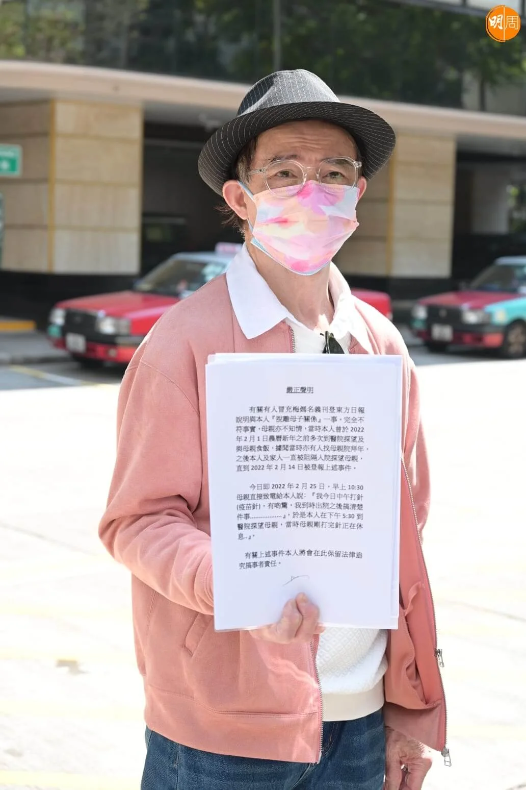 今日(27/02),梅啟明在北角一個公園舉行記者會,指梅媽與他脫離母子關係有內情,經他質問梅媽的私人看護,才得知原來是姪兒在背後唆擺,並表示已報警求助。提到梅媽曾說過會登報脫離母子關係,他指媽媽當時說的是氣話,不會付諸實行。目前疫情嚴峻,他透露梅媽剛接種第一劑新冠疫苗,需要休息,暫時不能到醫院探望梅媽,只能以電話聯繫。