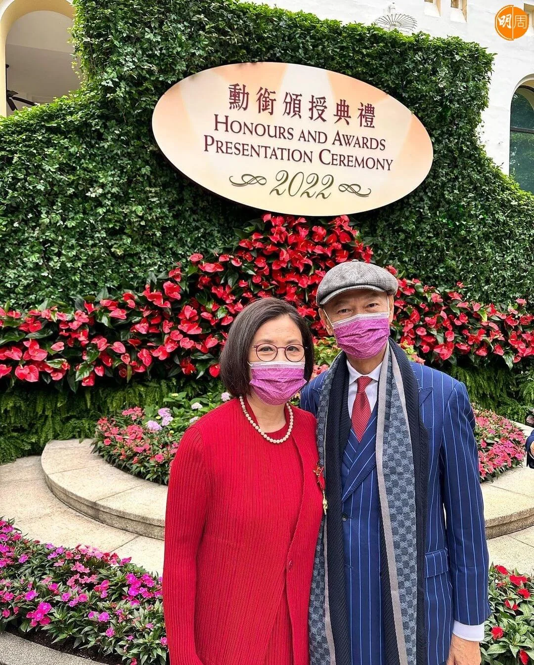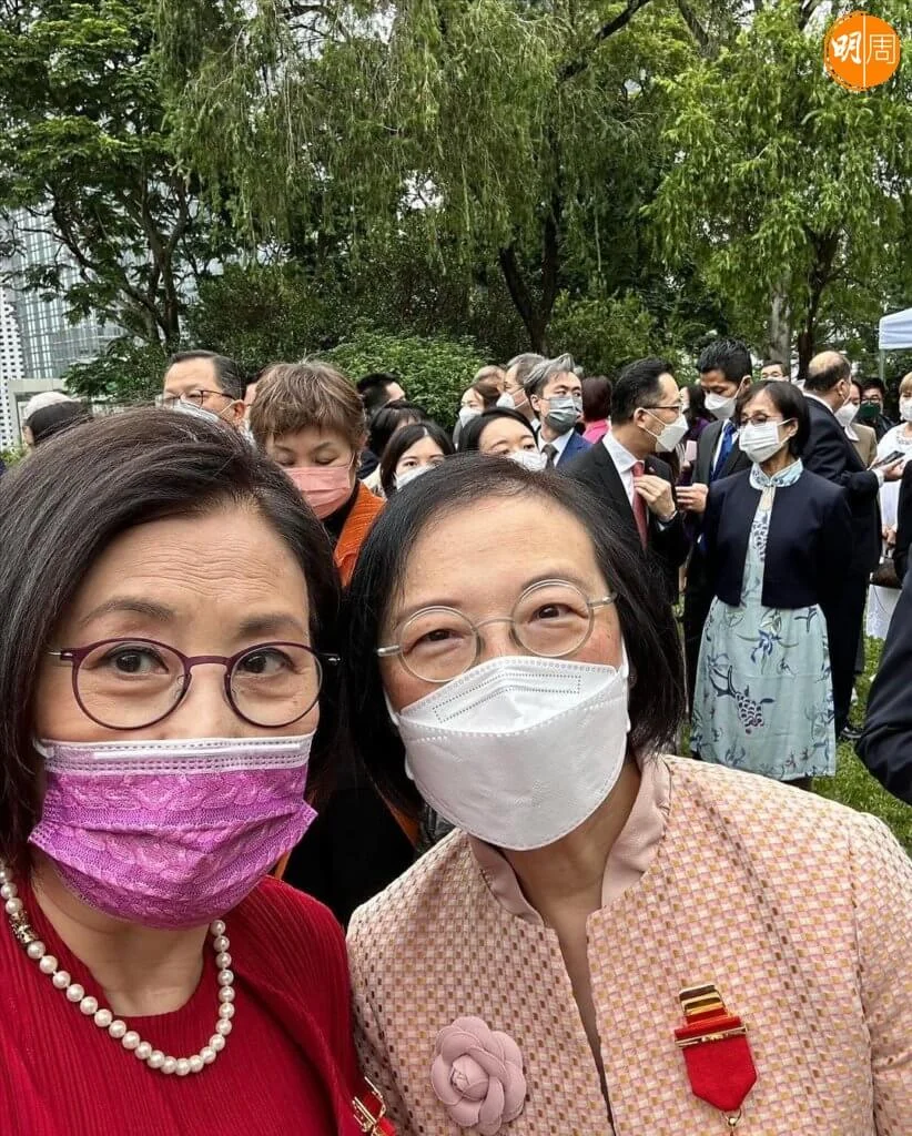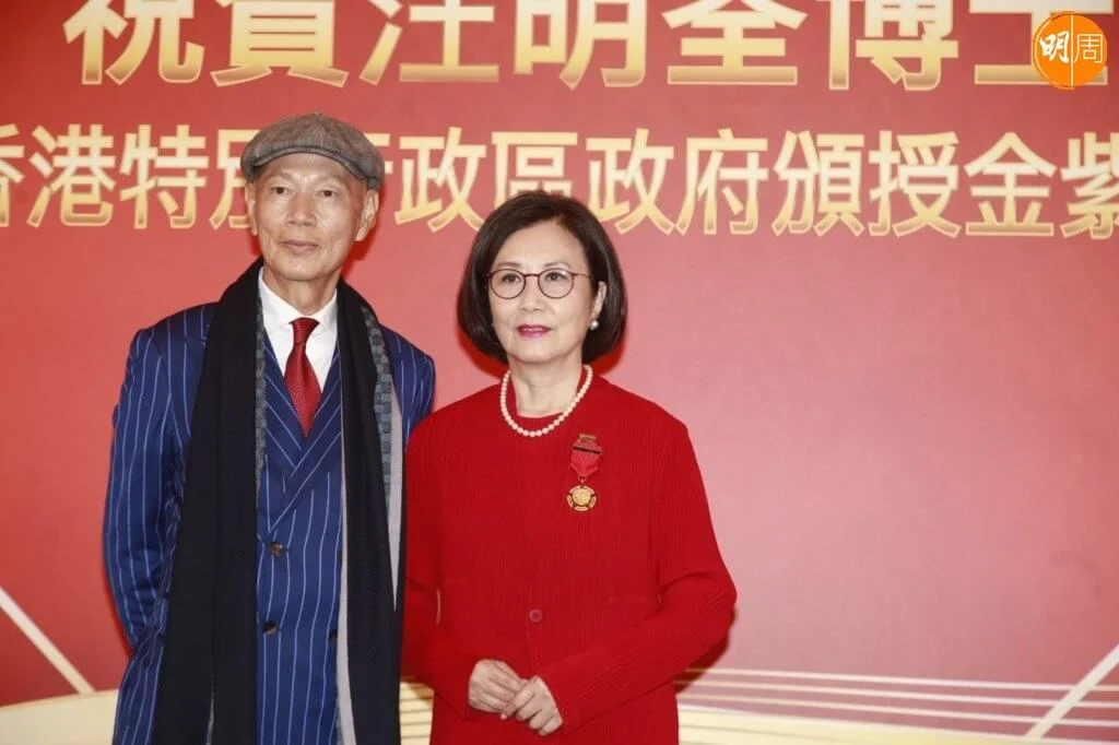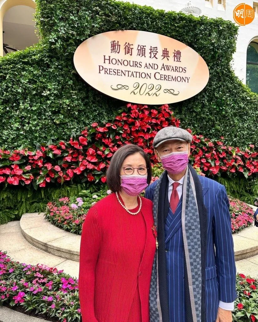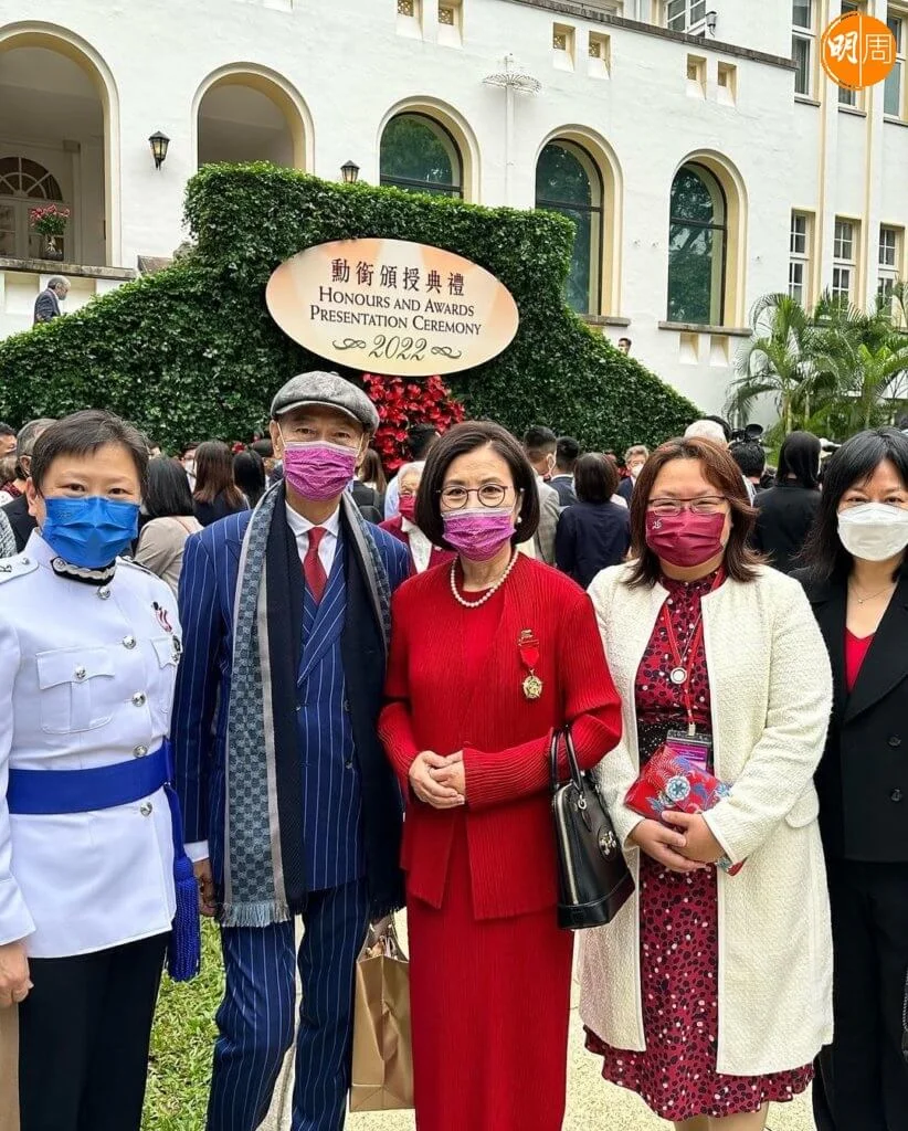 汪明荃今日(5日)出席禮賓府舉行的勳銜頒授典禮,接受特首李家超頒授的金紫荊星章。阿姐穿着紅色套裝,與老公羅家英結伴亮相,除了與特首及夫人一起合照,亦與前食衞局局長陳肇始及一眾賓客留影,記錄珍惜時刻。